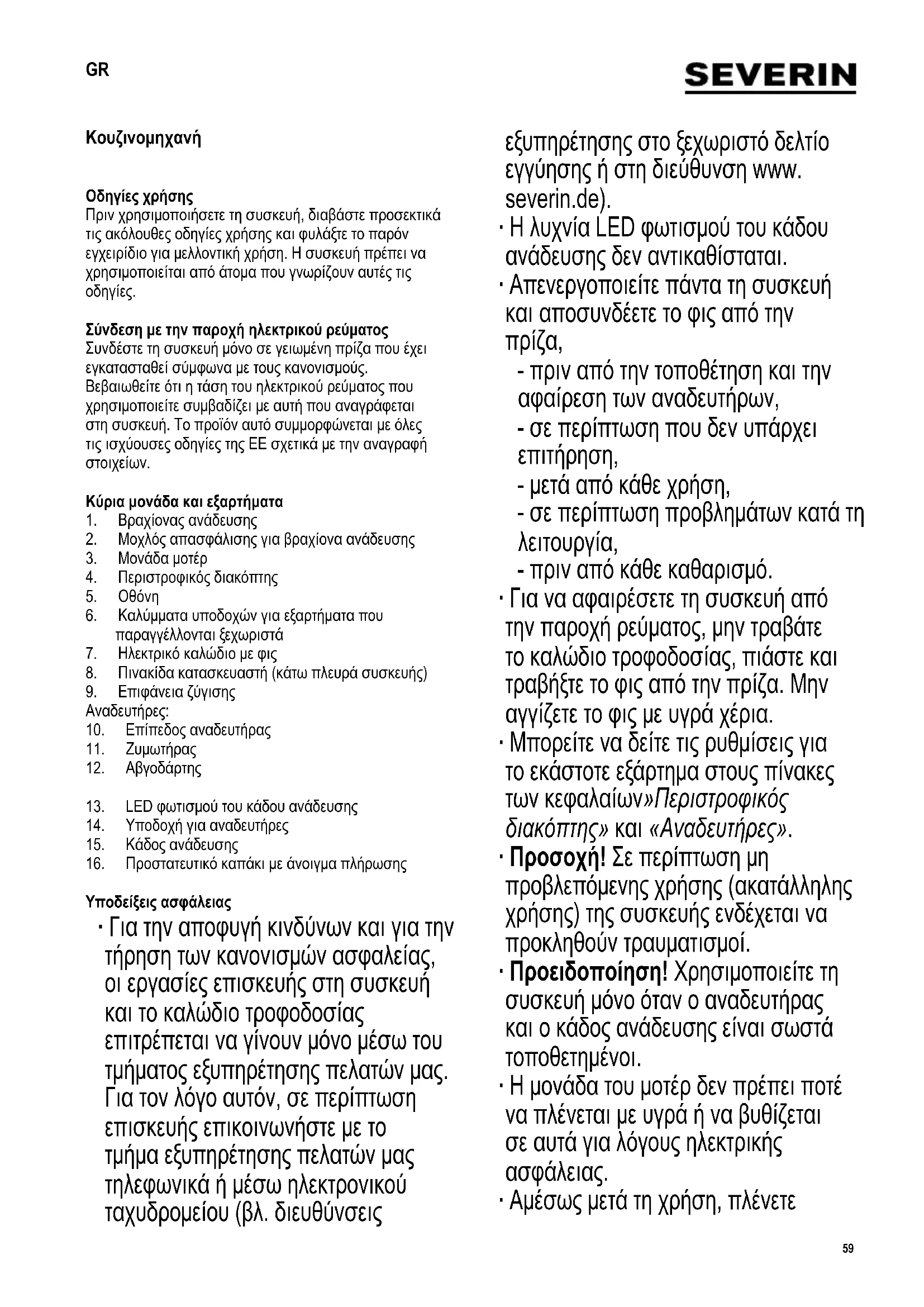 Υποδείξεις ασφάλειας ∙ Γιατηναποφυγήκινδύνωνκαιγιατην τήρησητωνκανονισμώνασφαλείας, οιεργασίεςεπισκευήςστησυσκευή καιτοκαλώδιοτροφοδοσίας επιτρέπεταιναγίνουνμόνομέσωτου τμήματοςεξυπηρέτησηςπελατώνμας. Γιατονλόγοαυτόν,σεπερίπτωση επισκευήςεπικοινωνήστεμετο τμήμαεξυπηρέτησηςπελατώνμας τηλεφωνικάήμέσωηλεκτρονικού ταχυδρομείου(βλ.διευθύνσεις εξυπηρέτησηςστοξεχωριστόδελτίο εγγύησηςήστηδιεύθυνσηwww. severin.de). ∙ ΗλυχνίαLEDφωτισμούτουκάδου ανάδευσηςδεναντικαθίσταται. ∙ Απενεργοποιείτεπάντατησυσκευή καιαποσυνδέετετοφιςαπότην
