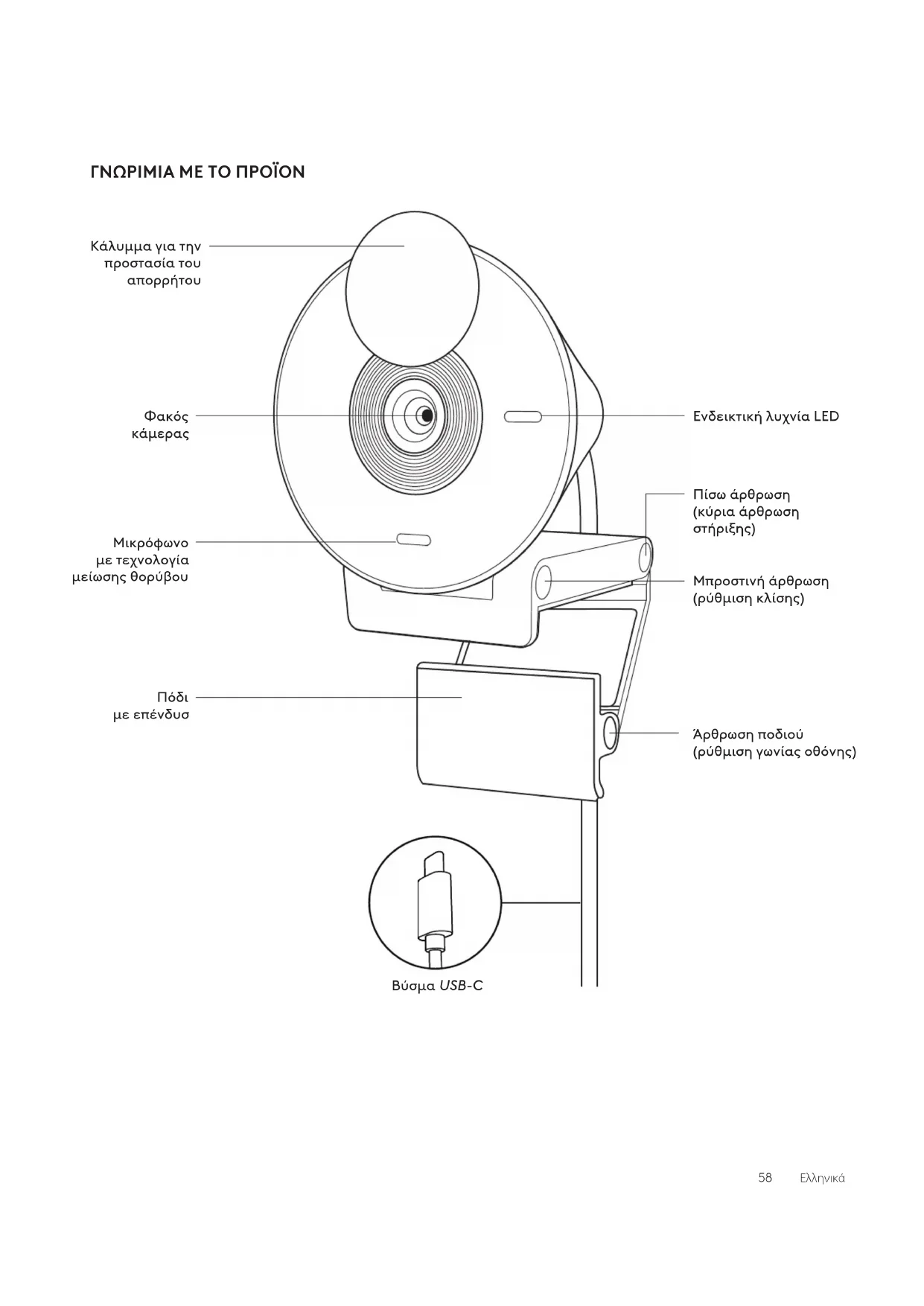 61Ελληνικά© 2023 Logitech. Οι επωνυίε Logitech και Logi, και το λογότυπο Logitech, είναι επορικά σήατα ή σήατα κατατεθέντα τη Logitech Europe S.A. ή/και των συγγενών εταιριών τη στι Η.Π.Α. και σε άλλε χώρε. Το USB-C και όλα τα υπόλοιπα επορικά σήατα αποτελούν ιδιοκτησία των αντίστοιχων κατόχων του. Η Logitech δεν αναλαβάνει καία ευθύνη για σφάλατα που ενδέχεται να υπάρχουν σε αυτό το εγχειρίδιο. Οι πληροφορίε που περιλαβάνονται στο παρόν υπόκεινται σε αλλαγέ χωρί προειδοποίηση. www.logitech.com/support/Brio300ЗНАКОМСТВО С ПРОДУКТОМ Светодиодный