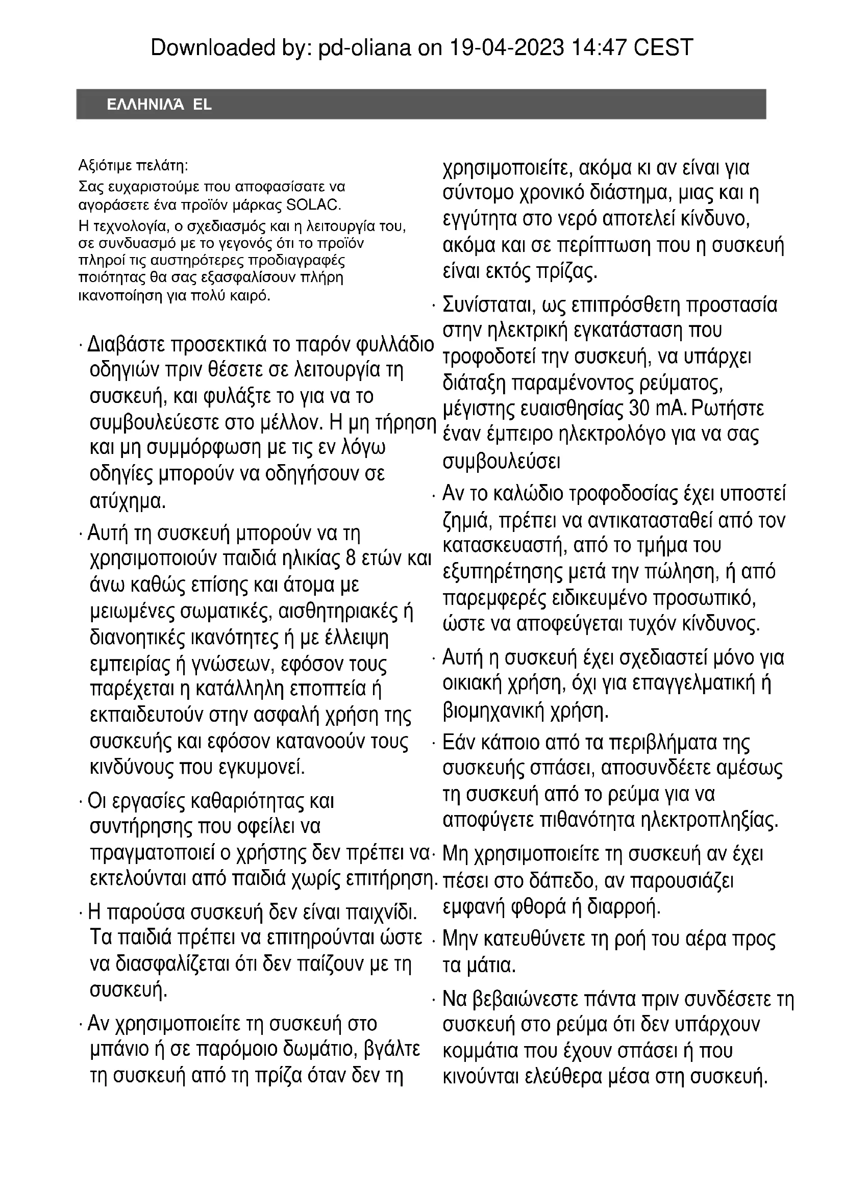 Downloaded by: pd-oliana on 19-04-2023 14:47 CESTEL - Αυτό το σύμβολο σημαίνει ότι εάν θέλετε να απαλλαγείτε από το προϊόν, όταν έχει ολοκληρωθεί ο κύκλος ζωής του, οφείλετε να το εναποθέσετε, με τα κατάλληλα μέσα, στα χέρια ενός διαχειριστή αποβλήτων, εγκεκριμένου για την επιλεκτική συλλογή αποβλήτων ειδών ηλεκτρικού και ηλεκτρονικού εξοπλισμού (ΑΗΗΕ). Το παρόν προϊόν συμμορφώνεται με την οδηγία 2014/35/ΕU χαμηλής τάσης, με την οδηγία 2014/30/ΕU για την ηλεκτρομαγνητική συμβατότητα, με την οδηγία 2011/65/ΕU για τον περιορισμό της χρήσης ορισμένων επικίνδυνων ουσιών σε ηλεκτρικό και ηλεκτρονικό εξοπλισμό και με την οδηγία 2009/125/ΕC για τις απαιτήσεις οικολογικού σχεδιασμού όσον αφορά τα συνδεόμενα με την ενέργεια προϊόντα. Downloaded by: pd-oliana on 19-04-2023 14:47 CESTČEŠKY CS Vážený zákazníku / Vážená zákaznice, Velmi vám děkujeme, že jste se rozhodl/a pro zakoupení výrobku značky SOLAC. Díky technologii, designu, typu provozu a skutečnosti, že produkt převyšuje nejpřísnější standardy kvality, zaručuje plně uspokojivé používání a dlouhou životnost.