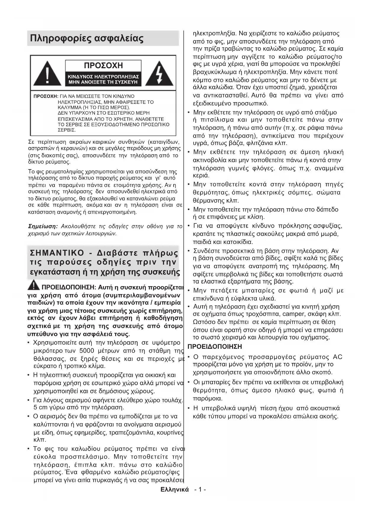 ΚΙΝΔΥΝΟΣ ΗΛΕΚΤΡΟΠΛΗΞΙΑΣΜΗΝ ΑΝΟΙΞΕΤΕ ΤΗ ΣΥΣΚΕΥΗΠΡΟΣΟΧΗ: ΓΙΑ ΝΑ ΜΕΙΩΣΕΤΕ ΤΟΝ ΚΙΝΔΥΝΟ ΗΛΕΚΤΡΟΠΛΗΞΙΑΣ, ΜΗΝ ΑΦΑΙΡΕΣΕΤΕ ΤΟ ΚΑΛΥΜΜΑ (Ή ΤΟ ΠΙΣΩ ΜΕΡΟΣ). ΔΕΝ ΥΠΑΡΧΟΥΝ ΣΤΟ ΕΣΩΤΕΡΙΚΟ ΜΕΡΗ ΕΠΙΣΚΕΥΑΣΙΜΑ ΑΠΟ ΤΟ ΧΡΗΣΤΗ. ΑΝΑΘΕΤΕΤΕ ΤΟ ΣΕΡΒΙΣ ΣΕ ΕΞΟΥΣΙΟΔΟΤΗΜΕΝΟ ΠΡΟΣΩΠΙΚΟ ΣΕΡΒΙΣ. Σημείωση: Ακολουθήστε τις οδηγίες στην οθόνη για το χειρισμό των σχετικών λειτουργιών. Σε περίπτωση ακραίων καιρικών συνθηκών (καταιγίδων, αστραπών ή κεραυνών) και σε μεγάλες περιόδους μη χρήσης (στις διακοπές σας), αποσυνδέετε την τηλεόραση από το δίκτυο ρεύματος. Το φις ρευματοληψίας χρησιμοποιείται για αποσύνδεση της τηλεόρασης από το δίκτυο παροχής ρεύματος και γι' αυτό πρέπει να παραμένει πάντα σε ετοιμότητα χρήσης. Αν η συσκευή της τηλεόρασης δεν αποσυνδεθεί ηλεκτρικά από το δίκτυο ρεύματος, θα εξακολουθεί να καταναλώνει ρεύμα σε κάθε περίπτωση, ακόμα και αν η τηλεόραση είναι σε κατάσταση αναμονής ή απενεργοποιημένη. ΣΗΜΑΝΤΙΚΟ - Διαβάστε πλήρως τις παρούσες οδηγίες πριν την εγκατάσταση ή τη χρήση της συσκευής ΠΡΟΕΙΔΟΠΟΙΗΣΗ: Αυτή η συσκευή προορίζεται για χρήση από άτομα (συμπεριλαμβανομένων παιδιών) τα οποία έχουν την ικανότητα / εμπειρία για χρήση μιας τέτοιας συσκευής χωρίς επιτήρηση, εκτός αν έχουν λάβει επιτήρηση ή καθοδήγηση σχετικά με τη χρήση της συσκευής από άτομο υπεύθυνο για την ασφάλειά τους.