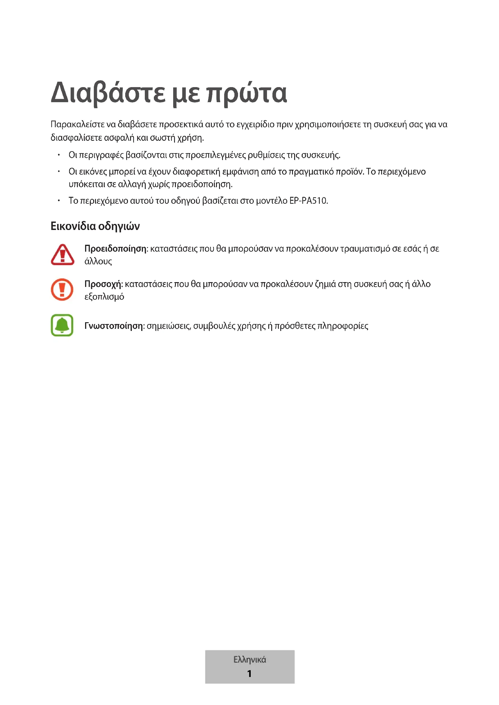 Το περιεχόμενο αυτού του οδηγού βασίζεται στο μοντέλο EP-PA510. Εικονίδια οδηγιών Προειδοποίηση: καταστάσεις που θα μπορούσαν να προκαλέσουν τραυματισμό σε εσάς ή σε