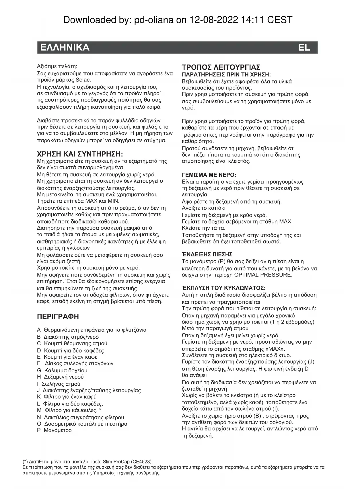 A Θερμαινόμενη επιφάνεια για τα φλυτζάνια B Διακόπτης ατμός/νερό C Κουμπί θέρμανσης ατμού D Κουμπί για δύο καφέδες E Κουμπί για έναν καφέ F Δίσκος συλλογής σταγόνων G Κάλυμμα δοχείου H Δεξαμενή νερού I Σωλήνας ατμού J Διακόπτης έναρξης/παύσης λειτουργίας K Φίλτρο για έναν καφέ L Φίλτρο για δύο καφέδες. M Φίλτρο για κάψουλες. * N Δακτύλιος συγκράτησης φίλτρου O Δοσομετρικό κουτάλι με πιεστήρα P Μανόμετρο (*) Διατίθεται μόνο στο μοντέλο Taste Slim ProCap (CE4523). Σε περίπτωση που το μοντέλο της συσκευή σας δεν διαθέτει τα εξαρτήματα που περιγράφονται παραπάνω, αυτά τα εξαρτήματα μπορείτε να τα αποκτήσετε μεμονωμένα από τις Υπηρεσίες τεχνικής συνδρομής. Αξιότιμε πελάτη: Σας ευχαριστούμε που αποφασίσατε να αγοράσετε ένα προϊόν μάρκας Solac. Η τεχνολογία, ο σχεδιασμός και η λειτουργία του, σε συνδυασμό με το γεγονός ότι το προϊόν πληροί τις αυστηρότερες προδιαγραφές ποιότητας θα σας εξασφαλίσουν πλήρη ικανοποίηση για πολύ καιρό. Διαβάστε προσεκτικά το παρόν φυλλάδιο οδηγιών πριν θέσετε σε λειτουργία τη συσκευή, και φυλάξτε το για να το συμβουλεύεστε στο μέλλον. Η μη τήρηση των παρακάτω οδηγιών μπορεί να οδηγήσει σε ατύχημα. ΤΡΟΠΟΣ ΛΕΙΤΟΥΡΓΙΑΣ ΠΑΡΑΤΗΡΗΣΕΙΣ ΠΡΙΝ ΤΗ ΧΡΗΣΗ: Βεβαιωθείτε ότι έχετε αφαιρέσει όλα τα υλικά συσκευασίας του προϊόντος. Πριν χρησιμοποιήσετε τη συσκευή για πρώτη φορά, σας συμβουλεύουμε να τη χρησιμοποιήσετε μόνο με