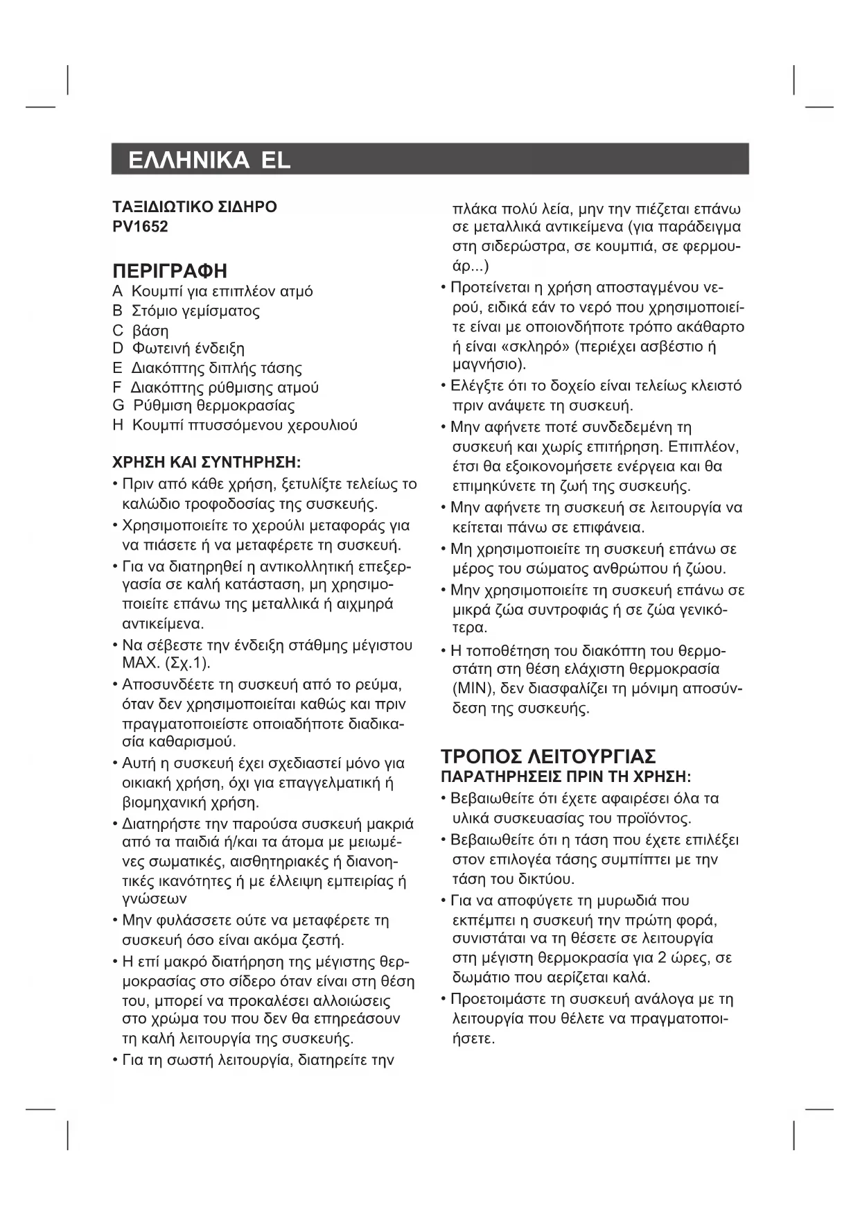 A Κουμπί για επιπλέον ατμό B Στόμιο γεμίσματος C βάση D Φωτεινή ένδειξη Ε Διακόπτης διπλής τάσης F Διακόπτης ρύθμισης ατμού G Ρύθμιση θερμοκρασίας H Κουμπί πτυσσόμενου χερουλιού ΧΡΗΣΗ ΚΑΊ ΣΎΝΤΗΡΗΣΗ: