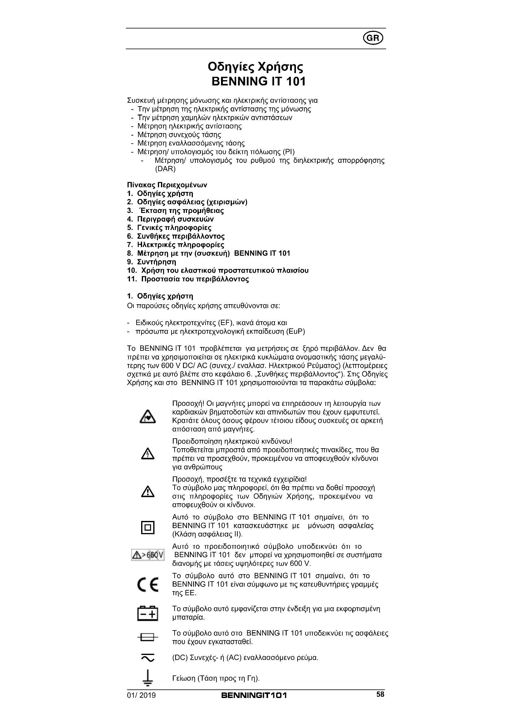 (DC) Συνεχές- ή (AC) εναλλασσόμενο ρεύμα. Γείωση (Τάση προς τη Γη).01/ 2019 BENNING IT 101