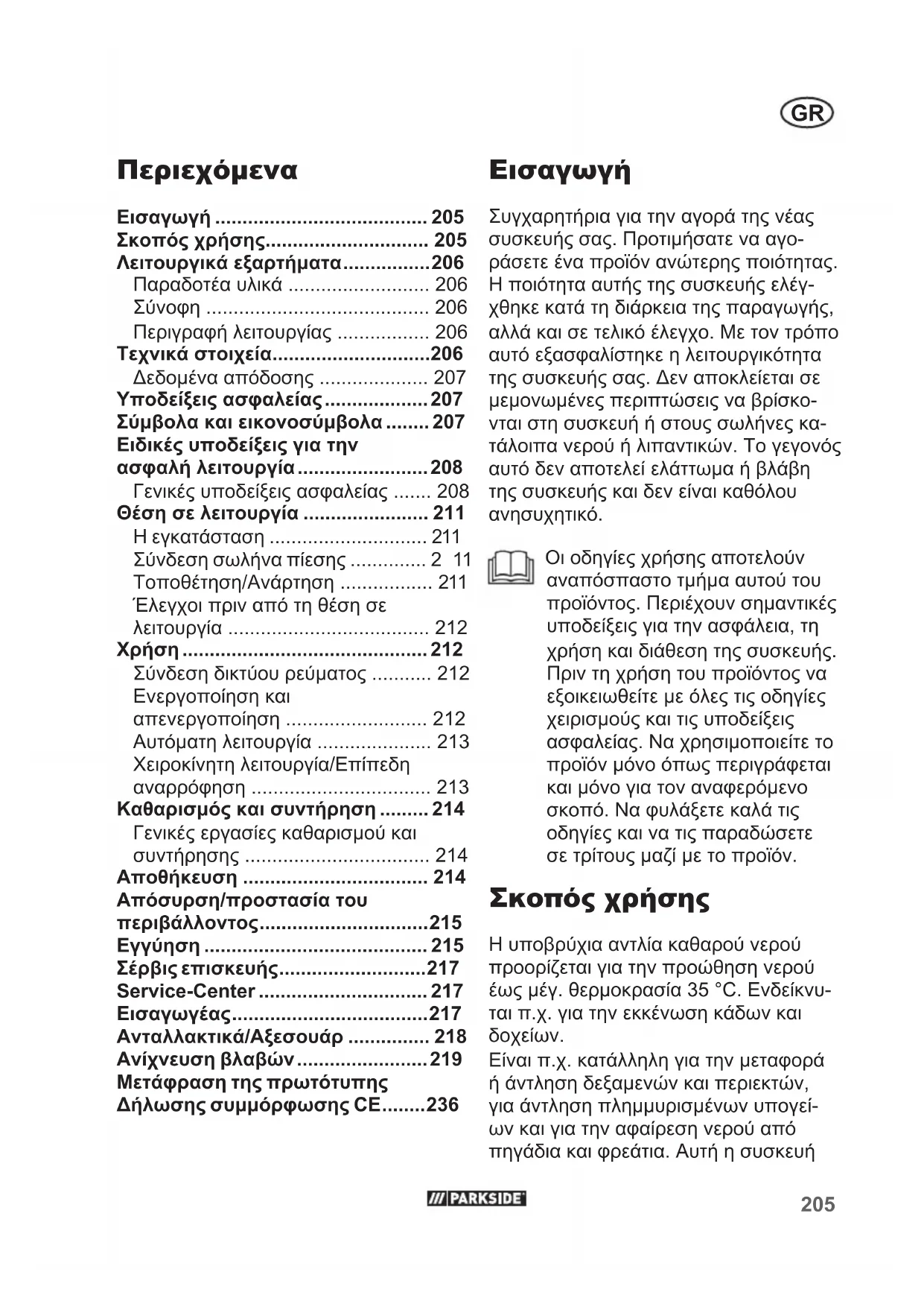 Δεν είναι κατάλληλη για νερό με uφφηλή συ- σκέντρωση σε άμμο! Διαβάστε προσεκτικά τις οδηγίες χρήσης, που σχε- τίζονται με τη συσκευή. Προσοχή! Σε περιπτώσεις που το καλώδιο έπαθε ζη- μία ή έχει κοπεί να βγάζετε αμέσως το ρευματολήπτη από τη πρίζα. 5,5 m Μεγαλύτερο εφικτό βάθος λειτουργίας. Ηλεκτρικές συσκευές δεν ανήκουν στα οικιακά απορ- ρίμματα.208