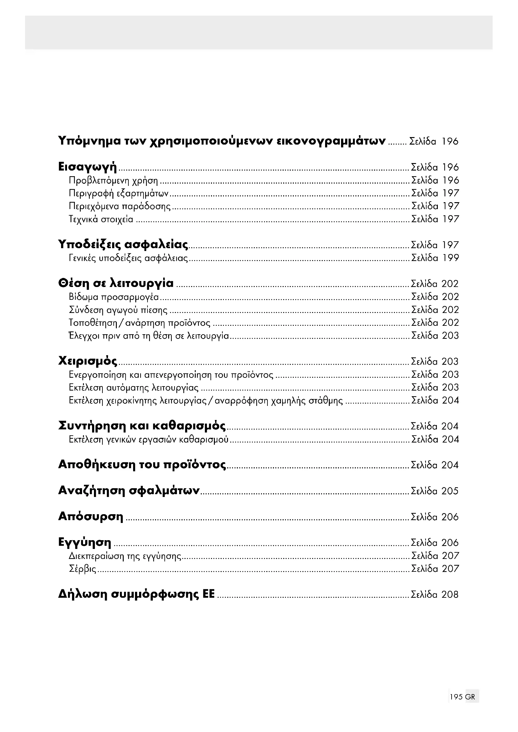 Εναλλασσόμενο ρεύμα/Εναλ- λασσόμενη τάση Ειδικές οδηγίες για την ασφαλή λειτουργία: Δεν επιτρέπεται η λειτουργία του προϊόντος όταν βρίσκο- νται άτομα μέσα στο νερό. Υφίσταται κίνδυνος από ηλε- κτροπληξία. Συνδέετε το προϊόν μόνο σε μια πρίζα με διάταξη προστα- σίας από ρεύμα διαρροής (αυτόματος διαρροής) με ονομαστικό ρεύμα διαρροής όχι πάνω από 30 mA. Ασφά- λεια τουλ. 6 Ampere. Εάν το καλώδιο τροφοδοσίας αυτού του προϊόντος πάθει ζημιά, πρέπει να αντικαταστα- θεί από τον κατασκευαστή, την υπηρεσία εξυπηρέτησης πελατών του ή αντίστοιχα εξει- δικευμένο άτομο, ώστε να αποφευχθούν κίνδυνοι. Το προϊόν αυτό μπορεί να χρησιμοποιηθεί από παιδιά 8 ετών και άνω, καθώς και από άτομα με περιορισμένες σωμα- τικές, αισθητηριακές ή πνευ- ματικές ικανότητες ή έλλειψη εμπειρίας και γνώσης, εάν επι- βλέπονται ή έχουν ενημερωθεί σχετικά με την ασφαλή χρήση του προϊόντος και κατανοούν τους κινδύνους που προκύ- πτουν από αυτό. Τα παιδιά δεν επιτρέπεται να παίζουν με το προϊόν. Ο καθαρισμός και η συντήρηση χρήστη απαγο- ρεύεται να εκτελούνται από παιδιά, εκτός εάν επιβλέπο- νται.199 GR Τα παιδιά πρέπει να επιβλέπο- νται, ώστε να διασφαλίζεται ότι δεν παίζουν με το προϊόν. Ενδέχεται να προκύψει ρύ- πανση του υγρού από διαρ- ροή λιπαντικών. Λάβετε υπόψη τις περαιτέρω υποδείξεις στο κεφάλαιο «Κα- θαρισμός και φροντίδα». Γενικές υποδείξεις
