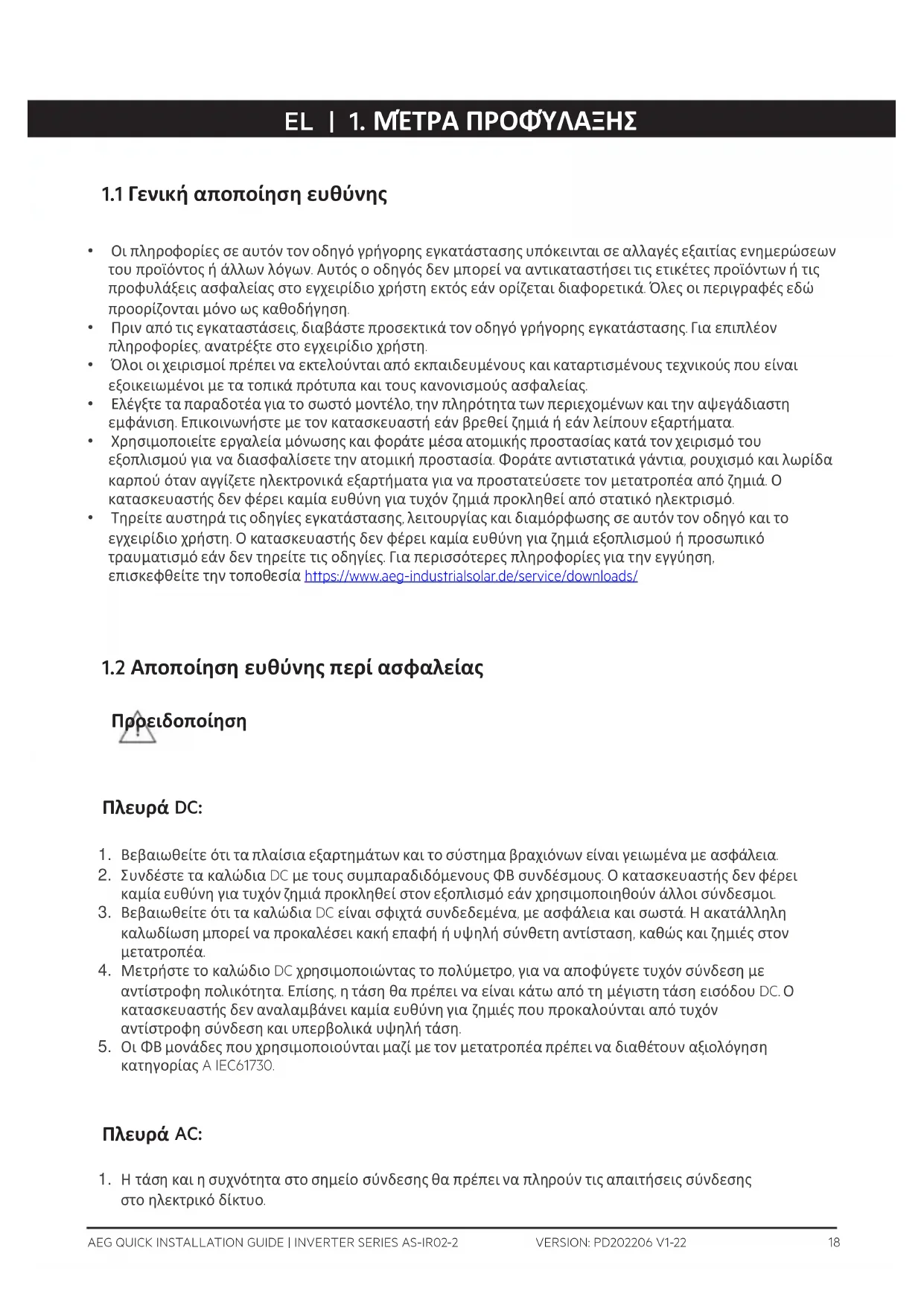 - Τηρείτε αυστηρά τις οδηγίες εγκατάστασης, λειτουργίας και διαμόρφωσης σε αυτόν τον οδηγό και το εγχειρίδιο χρήστη. Ο κατασκευαστής δεν φέρει καμία ευθύνη για ζημιά εξοπλισμού ή προσωπικό τραυματισμό εάν δεν τηρείτε τις οδηγίες. Για περισσότερες πληροφορίες για την εγγύηση, επισκεφθείτε την τοποθεσία https://www.aeg-industrialsolar.de/service/downloads/