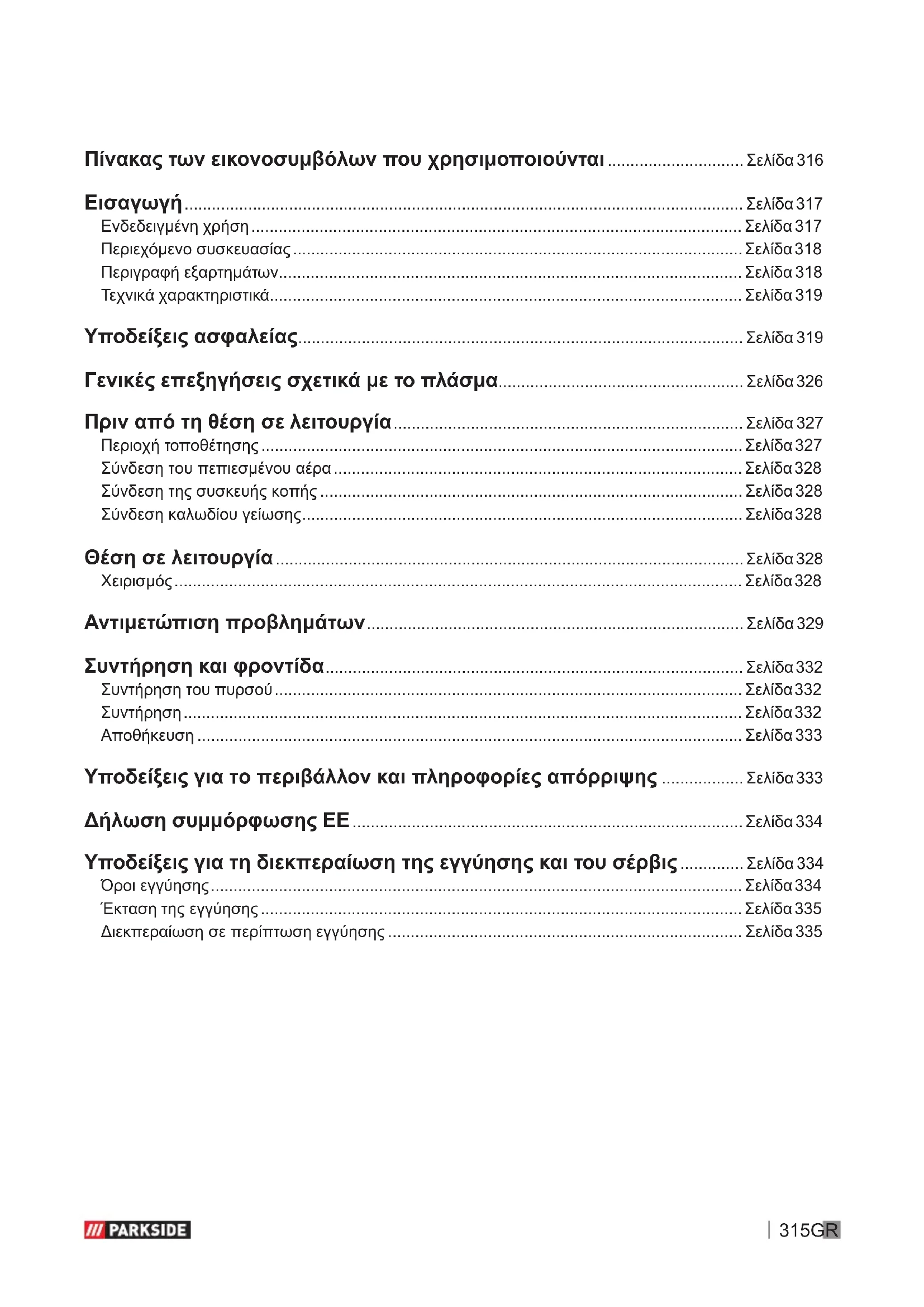 теля по ал. 1 не е обвързано с никакъв друг срок за предявяване на иск, различен от срока по ал. 1.315GR Πίνακας των εικονοσυμβόλων που χρησιμοποιούνται .............................. Σελίδα 316 Εισαγωγή ........................................................................................................................... Σελίδα 317 Ενδεδειγμένη χρήση ............................................................................................................ Σελίδα 317 Περιεχόμενο συσκευασίας ................................................................................................... Σελίδα 318 Περιγραφή εξαρτημάτων ...................................................................................................... Σελίδα 318 Τεχνικά χαρακτηριστικά ........................................................................................................ Σελίδα 319 Υποδείξεις ασφαλείας .................................................................................................. Σελίδα 319 Γενικές επεξηγήσεις σχετικά με το πλάσμα...................................................... Σελίδα 326 Πριν από τη θέση σε λειτουργία ............................................................................. Σελίδα 327 Περιοχή τοποθέτησης .......................................................................................................... Σελίδα 327 Σύνδεση του πεπιεσμένου αέρα .......................................................................................... Σελίδα 328 Σύνδεση της συσκευής κοπής ............................................................................................. Σελίδα 328 Σύνδεση καλωδίου γείωσης ................................................................................................. Σελίδα 328 Θέση σε λειτουργία ....................................................................................................... Σελίδα 328 Χειρισμός ............................................................................................................................. Σελίδα 328 Αντιμετώπιση προβλημάτων ................................................................................... Σελίδα 329 Συντήρηση και φροντίδα ............................................................................................ Σελίδα 332 Συντήρηση του πυρσού ....................................................................................................... Σελίδα 332 Συντήρηση ........................................................................................................................... Σελίδα 332 Αποθήκευση ........................................................................................................................ Σελίδα 333 Υποδείξεις για το περιβάλλον και πληροφορίες απόρριψης .................. Σελίδα 333 Δήλωση συμμόρφωσης ΕΕ ...................................................................................... Σελίδα 334 Υποδείξεις για τη διεκπεραίωση της εγγύησης και του σέρβις .............. Σελίδα 334 Όροι εγγύησης ..................................................................................................................... Σελίδα 334 Έκταση της εγγύησης .......................................................................................................... Σελίδα 335 Διεκπεραίωση σε περίπτωση εγγύησης .............................................................................. Σελίδα 335316 GR