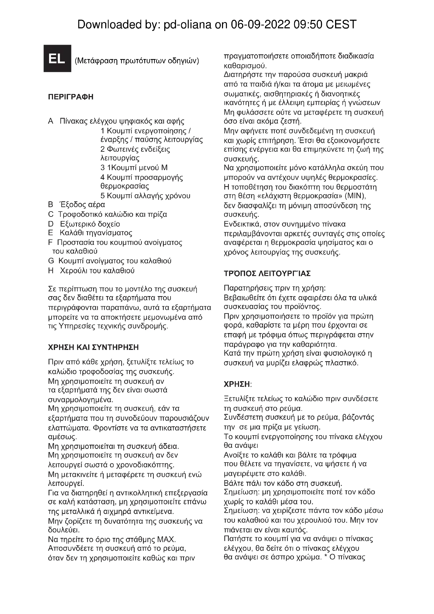 A Πίνακας ελέγχου ψηφιακός και αφής 1 Κουμπί ενεργοποίησης / έναρξης / παύσης λειτουργίας 2 Φωτεινές ενδείξεις λειτουργίας 3 1Κουμπί μενού M 4 Κουμπί προσαρμογής θερμοκρασίας 5 Κουμπί αλλαγής χρόνου B Έξοδος αέρα C Τροφοδοτικό καλώδιο και πρίζα D Eξωτερικό δοχείο E Καλάθι τηγανίσματος F Προστασία του κουμπιού ανοίγματος του καλαθιού G Κουμπί ανοίγματος του καλαθιού H Χερούλι του καλαθιού Σε περίπτωση που το μοντέλο της συσκευή σας δεν διαθέτει τα εξαρτήματα που περιγράφονται παραπάνω, αυτά τα εξαρτήματα μπορείτε να τα αποκτήσετε μεμονωμένα από τις Υπηρεσίες τεχνικής συνδρομής. ΧΡΗΣΗ ΚΑΙ ΣΥΝΤΗΡΗΣΗ Πριν από κάθε χρήση, ξετυλίξτε τελείως το καλώδιο τροφοδοσίας της συσκευής. Μη χρησιμοποιείτε τη συσκευή αν τα εξαρτήματά της δεν είναι σωστά συναρμολογημένα. Μη χρησιμοποιείτε τη συσκευή, εάν τα εξαρτήματα που τη συνοδεύουν παρουσιάζουν ελαττώματα. Φροντίστε να τα αντικαταστήσετε