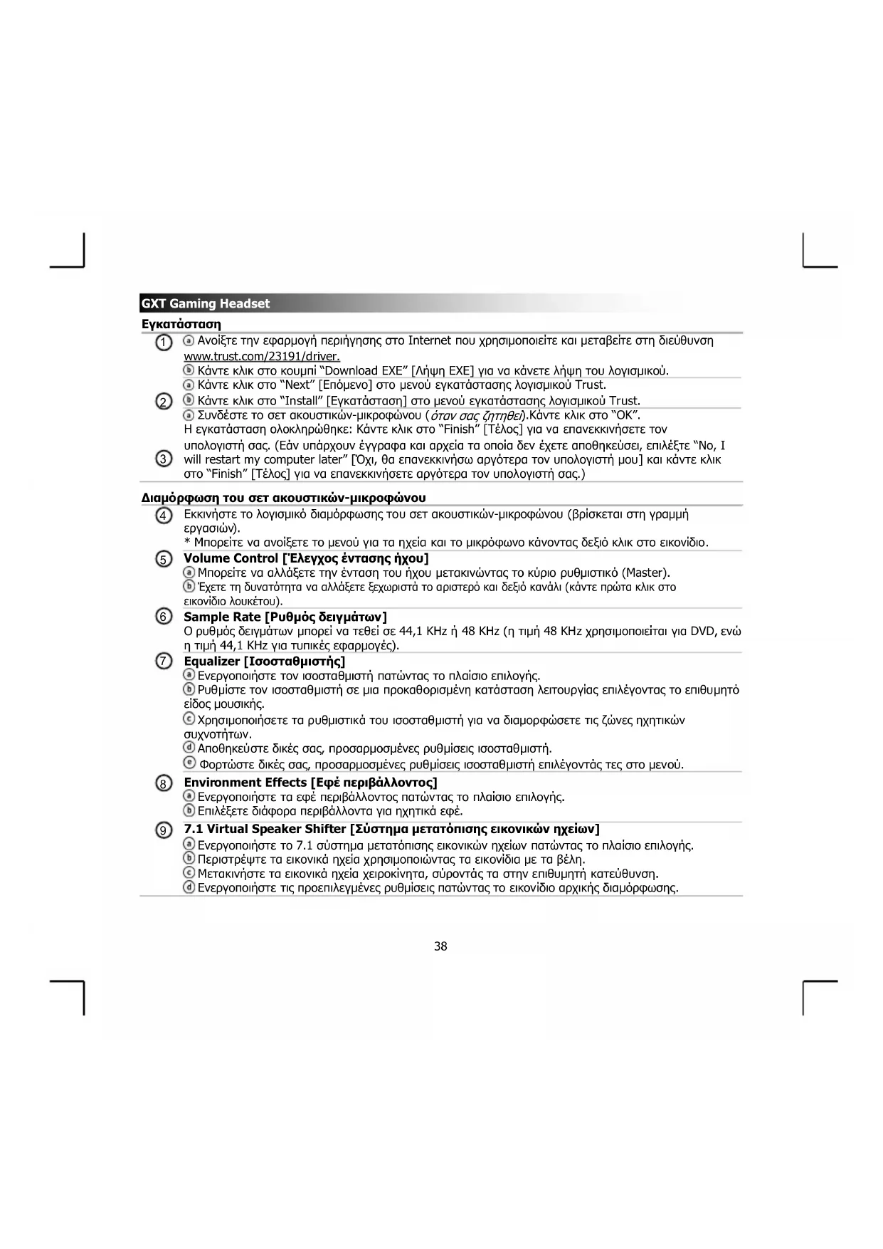 Ανοίξτε την εφαρμογή περιήγησης στο Internet που χρησιμοποιείτε και μεταβείτε στη διεύθυνση www .trust.com/23191/driver. Κάντε κλικ στο κουμπί “Download EXE” [Λήψη EXE] για να κάνετε λήψη του λογισμικού. Κάντε κλικ στο “Next” [Επόμενο] στο μενού εγκατάστασης λογισμικού Trust. Κάντε κλικ στο “Install” [Εγκατάσταση] στο μενού εγκατάστασης λογισμικού Trust. Συνδέστε το σετ ακουστικών-μικροφώνου ( όταν σας ζητηθεί ).Κάντε κλικ στο “OK”.