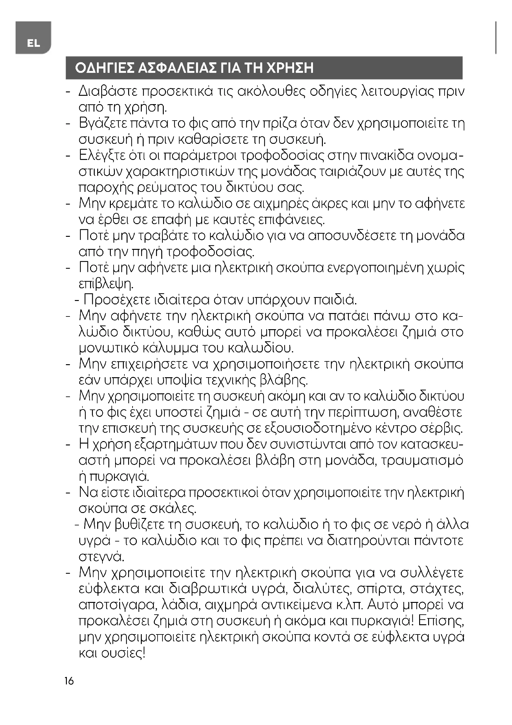 - Η ηλεκτρική σκούπα προορίζεται μόνο για οικιακή χρήση.