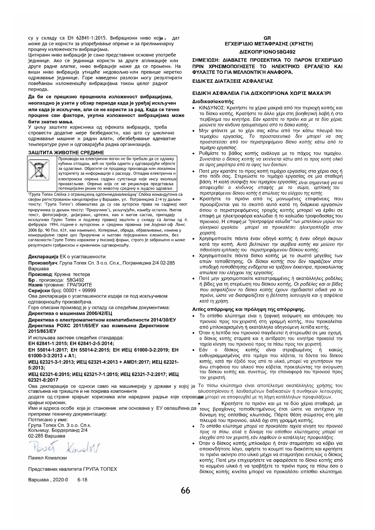 "Grupa Topex Spółka z ograniczoną odpowiedzialnością" Spółka komandytowa με έδρα στη Βαρσοβία, ul. Pograniczna 2/4 (στο εξής: "Grupa Topex") ενημερώνει ότι όλα τα πνευματικά δικαιώματα επί του περιεχομένου του παρόντος εγχειριδίου (στο εξής: "Εγχειρίδιο"), συμπεριλαμβανομένων, μεταξύ άλλων. το κείμενο, τις φωτογραφίες, τα διαγράμματα, τα σχέδια, καθώς και τη σύνθεσή του, ανήκουν αποκλειστικά στην Grupa Topex και αποτελούν αντικείμενο νομικής προστασίας σύμφωνα με τον νόμο της 4ης Φεβρουαρίου 1994 περί πνευματικής ιδιοκτησίας και συγγενικών δικαιωμάτων (δηλ. Εφημερίδα της Κυβερνήσεως 2006 αριθ. 90 Poz. 631, όπως τροποποιήθηκε). Η αντιγραφή, επεξεργασία, δημοσίευση, τροποποίηση για εμπορικούς σκοπούς ολόκληρου του Εγχειριδίου και των επιμέρους στοιχείων του, χωρίς τη γραπτή συγκατάθεση της Grupa Topex, απαγορεύεται αυστηρά και μπορεί να επιφέρει αστικές και ποινικές ευθύνες. Δήλωση συμμόρφωσης ΕΚ Κατασκευαστής: Grupa Topex Sp. Z o.o. Sp.k., Pograniczna 2/4 02- 285 Βαρσοβία Προϊόν: Κυκλικό πριόνι Αριθμός προϊόντος: 58G492 Εμπορική ονομασία: ΓΡΑΦΙΤΗΣ Σειριακός αριθμός: 00001 ÷ 99999 Η παρούσα δήλωση συμμόρφωσης εκδίδεται με αποκλειστική ευθύνη του κατασκευαστή. Το προϊόν που περιγράφεται παραπάνω συμμορφώνεται με τα ακόλουθα