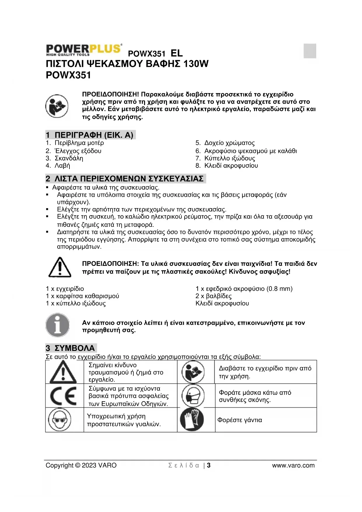 12 ΕΓΓΥΗΣΗ........................................................................................ 11 13 ΠΕΡΙΒΑΛΛΟΝ ................................................................................ 12 14 ΔΗΛΩΣΗ ΣΥΜΜΟΡΦΩΣΗΣ ........................................................... 12POWX351 EL Copyright © 2023 VARO Σ ε λ ί δ α | 3 www.varo.com ΠΙΣΤΟΛΙ ΨΕΚΑΣΜΟΥ ΒΑΦΗΣ 130W POWX351 ΠΡΟΕΙΔΟΠΟΙΗΣΗ! Παρακαλούμε διαβάστε προσεκτικά το εγχειρίδιο χρήσης πριν από τη χρήση και φυλάξτε το για να ανατρέχετε σε αυτό στο μέλλον. Εάν μεταβιβάσετε αυτό το ηλεκτρικό εργαλείο, παραδώστε μαζί και τις οδηγίες χρήσης. 1 ΠΕΡΙΓΡΑΦΗ (ΕΙΚ. A)