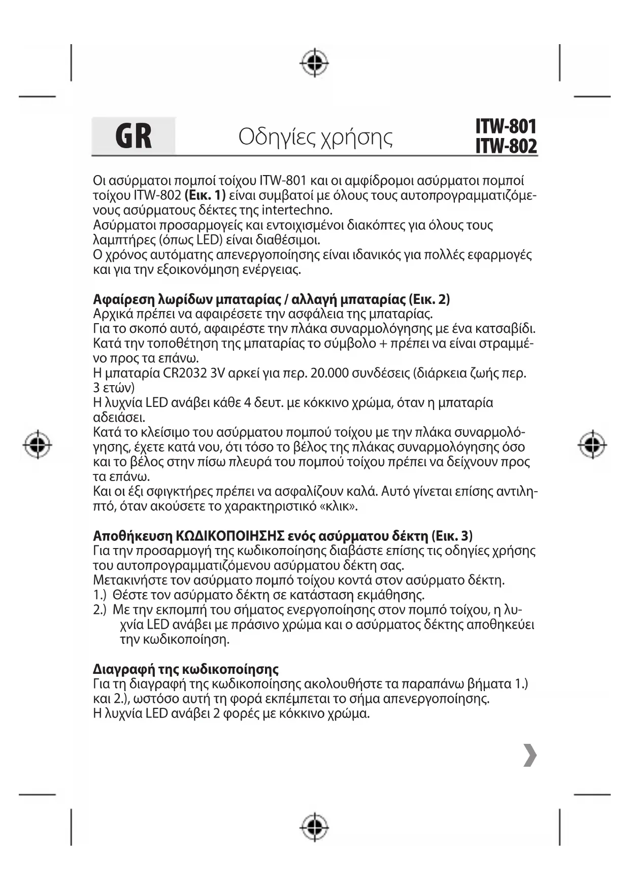ITW-801 ITW-802› Οι ασύρματοι πομποί τοίχου ITW-801 και οι αμφίδρομοι ασύρματοι πομποί τοίχου ITW-802 (Εικ. 1) είναι συμβατοί με όλους τους αυτοπρογραμματιζόμε- νους ασύρματους δέκτες της intertechno. Ασύρματοι προσαρμογείς και εντοιχισμένοι διακόπτες για όλους τους λαμπτήρες (όπως LED) είναι διαθέσιμοι. Ο χρόνος αυτόματης απενεργοποίησης είναι ιδανικός για πολλές εφαρμογές και για την εξοικονόμηση ενέργειας. Αφαίρεση λωρίδων μπαταρίας / αλλαγή μπαταρίας (Εικ. 2) Αρχικά πρέπει να αφαιρέσετε την ασφάλεια της μπαταρίας. Για το σκοπό αυτό, αφαιρέστε την πλάκα συναρμολόγησης με ένα κατσαβίδι. Κατά την τοποθέτηση της μπαταρίας το σύμβολο + πρέπει να είναι στραμμέ- νο προς τα επάνω. Η μπαταρία CR2032 3V αρκεί για περ. 20.000 συνδέσεις (διάρκεια ζωής περ. 3 ετών) Η λυχνία LED ανάβει κάθε 4 δευτ. με κόκκινο χρώμα, όταν η μπαταρία