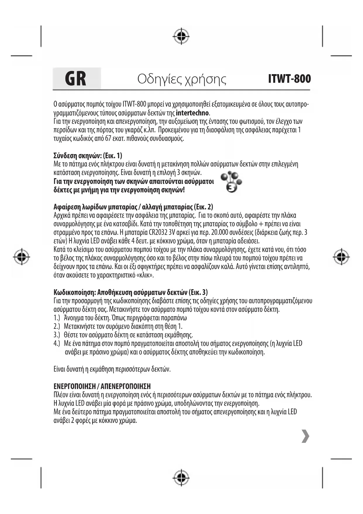 ITWT-800› Ο ασύρματος πομπός τοίχου ITWT-800 μπορεί να χρησιμοποιηθεί εξατομικευμένα σε όλους τους αυτοπρο- γραμματιζόμενους τύπους ασύρματων δεκτών της intertechno.Για την ενεργοποίηση και απενεργοποίηση, την αυξομείωση της έντασης του φωτισμού, τον έλεγχο των περσίδων και της πόρτας του γκαράζ κ.λπ. Προκειμένου για τη διασφάλιση της ασφάλειας παρέχεται 1 τυχαίος κωδικός από 67 εκατ. πιθανούς συνδυασμούς. Σύνδεση σκηνών: (Εικ. 1)Με το πάτημα ενός πλήκτρου είναι δυνατή η μετακίνηση πολλών ασύρματων δεκτών στην επιλεγμένη κατάσταση ενεργοποίησης. Είναι δυνατή η επιλογή 3 σκηνών. Για την ενεργοποίηση των σκηνών απαιτούνται ασύρματοι δέκτες με μνήμη για την ενεργοποίηση σκηνών! Αφαίρεση λωρίδων μπαταρίας / αλλαγή μπαταρίας (Εικ. 2)Αρχικά πρέπει να αφαιρέσετε την ασφάλεια της μπαταρίας. Για το σκοπό αυτό, αφαιρέστε την πλάκα συναρμολόγησης με ένα κατσαβίδι. Κατά την τοποθέτηση της μπαταρίας το σύμβολο + πρέπει να είναι στραμμένο προς τα επάνω. Η μπαταρία CR2032 3V αρκεί για περ. 20.000 συνδέσεις (διάρκεια ζωής περ. 3 ετών) Η λυχνία LED ανάβει κάθε 4 δευτ. με κόκκινο χρώμα, όταν η μπαταρία αδειάσει.Κατά το κλείσιμο του ασύρματου πομπού τοίχου με την πλάκα συναρμολόγησης, έχετε κατά νου, ότι τόσο το βέλος της πλάκας συναρμολόγησης όσο και το βέλος στην πίσω πλευρά του πομπού τοίχου πρέπει να δείχνουν προς τα επάνω. Και οι έξι σφιγκτήρες πρέπει να ασφαλίζουν καλά. Αυτό γίνεται επίσης αντιληπτό, όταν ακούσετε το χαρακτηριστικό «κλικ».Κωδικοποίηση: Αποθήκευση ασύρματων δεκτών (Εικ. 3)Για την προσαρμογή της κωδικοποίησης διαβάστε επίσης τις οδηγίες χρήσης του αυτοπρογραμματιζόμενου ασύρματου δέκτη σας. Μετακινήστε τον ασύρματο πομπό τοίχου κοντά στον ασύρματο δέκτη.1.) Άνοιγμα του δέκτη. Όπως περιγράφεται παραπάνω 2.) Μετακινήστε τον συρόμενο διακόπτη στη θέση 1.3.) Θέστε τον ασύρματο δέκτη σε κατάσταση εκμάθησης.4.) Με ένα πάτημα στον πομπό πραγματοποιείται αποστολή του σήματος ενεργοποίησης (η λυχνία LED ανάβει με πράσινο χρώμα) και ο ασύρματος δέκτης αποθηκεύει την κωδικοποίηση.Είναι δυνατή η εκμάθηση περισσότερων δεκτών.ΕΝΕΡΓΟΠΟΙΗΣΗ / ΑΠΕΝΕΡΓΟΠΟΙΗΣΗΠλέον είναι δυνατή η ενεργοποίηση ενός ή περισσότερων ασύρματων δεκτών με το πάτημα ενός πλήκτρου. Η λυχνία LED ανάβει μία φορά με πράσινο χρώμα, υποδηλώνοντας την ενεργοποίηση. Με ένα δεύτερο πάτημα πραγματοποιείται αποστολή του σήματος απενεργοποίησης και η λυχνία LED ανάβει 2 φορές με κόκκινο χρώμα.