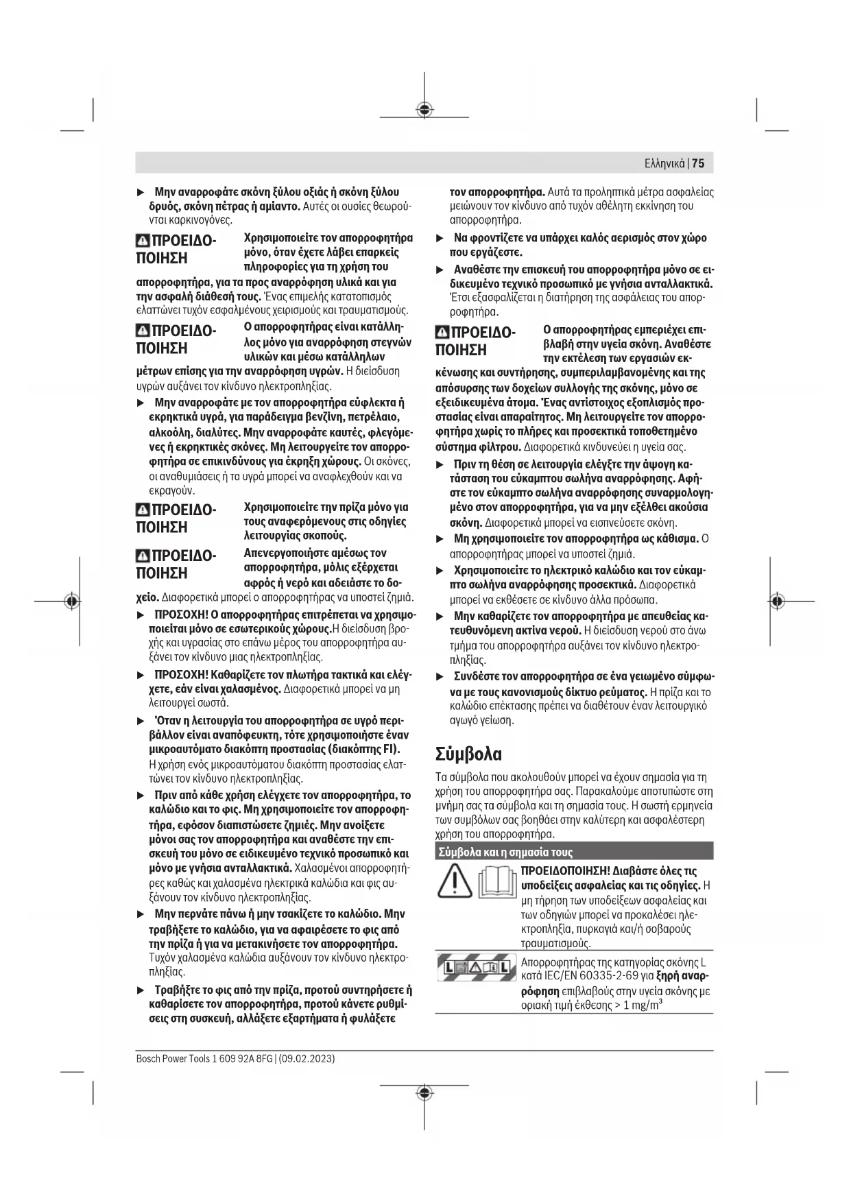 Υποδείξεις ασφαλείας για απορροφητήρες Διαβάστε όλες τις υποδείξεις ασφαλείας και τις οδηγίες. Η μη τήρηση των υποδείξεων ασφαλείας και των οδηγιών μπορεί να προκα- λέσει ηλεκτροπληξία, πυρκαγιά και/ή σοβαρούς τραυματισμούς. Φυλάξτε όλες τις προειδοποιητικές υποδείξεις και οδηγίες για κάθε μελλοντική χρήση. u Αυτός ο απορροφητήρας δεν προ- βλέπεται για χρήση από παιδιά και άτομα με περιορισμένες φυσικές, αισθητήριες ή διανοητικές ικανότη- τες ή με έλλειψη εμπειρίας και ανε- παρκείς γνώσεις. Διαφορετικά υπάρ- χει κίνδυνος λανθασμένου χειρισμού και τραυματισμού. u Επιβλέπετε τα παιδιά. Έτσι εξασφα- λίζεται, ότι τα παιδιά δε θα παίξουν με τον απορροφητήρα. 1 609 92A 8FG | (09.02.2023) Bosch Power ToolsΕλληνικά | 75 u Μην αναρροφάτε σκόνη ξύλου οξιάς ή σκόνη ξύλου δρυός, σκόνη πέτρας ή αμίαντο. Αυτές οι ουσίες θεωρού- νται καρκινογόνες.