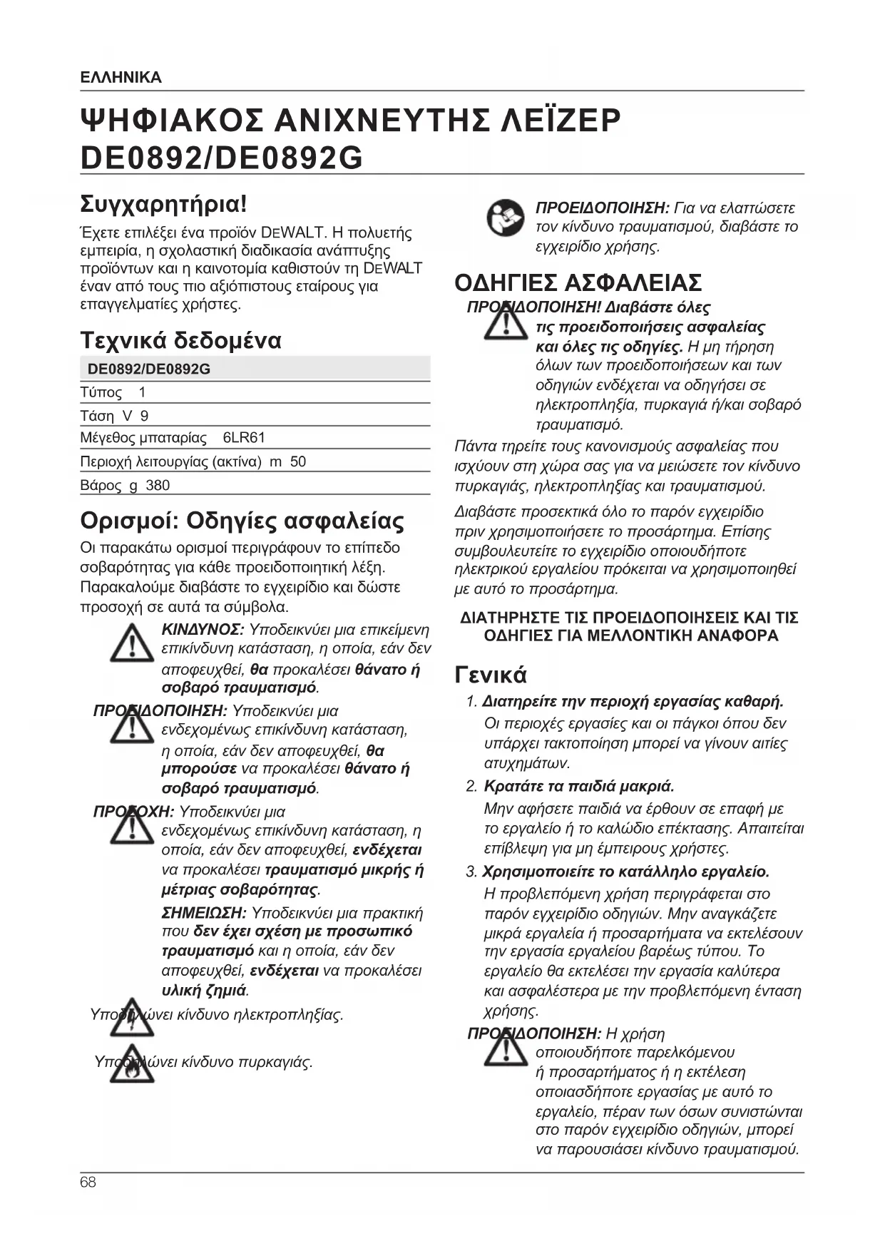 Συγχαρητήρια! Έχετε επιλέξει ένα προϊόν DeWALT. Η πολυετής εμπειρία, η σχολαστική διαδικασία ανάπτυξης προϊόντων και η καινοτομία καθιστούν τη DeWALT έναν από τους πιο αξιόπιστους εταίρους για επαγγελματίες χρήστες. Τεχνικά δεδομένα DE0892/DE0892G Τύπος 1 Τάση V 9 Μέγεθος μπαταρίας 6LR61 Περιοχή λειτουργίας (ακτίνα) m 50 Βάρος g 380 Ορισμοί: Οδηγίες ασφαλείας Οι παρακάτω ορισμοί περιγράφουν το επίπεδο σοβαρότητας για κάθε προειδοποιητική λέξη. Παρακαλούμε διαβάστε το εγχειρίδιο και δώστε προσοχή σε αυτά τα σύμβολα. ΚΙΝΔΥΝΟΣ:Υποδεικνύει μια επικείμενη επικίνδυνη κατάσταση, η οποία, εάν δεν αποφευχθεί, θα προκαλέσει θάνατοή σοβαρότραυματισμό. ΠΡΟΕΙΔΟΠΟΙΗΣΗ:Υποδεικνύει μια ενδεχομένως επικίνδυνη κατάσταση, η οποία, εάν δεν αποφευχθεί, θα μπορούσε να προκαλέσει θάνατοή σοβαρότραυματισμό. ΠΡΟΣΟΧΗ:Υποδεικνύει μια ενδεχομένως επικίνδυνη κατάσταση, η οποία, εάν δεν αποφευχθεί,ενδέχεται να προκαλέσει τραυματισμόμικρήςή μέτριαςσοβαρότητας. ΣΗΜΕΙΩΣΗ:Υποδεικνύει μια πρακτική που δενέχεισχέσημεπροσωπικό τραυματισμό και η οποία, εάν δεν αποφευχθεί, ενδέχεταινα προκαλέσει υλικήζημιά. Υποδηλώνει κίνδυνο ηλεκτροπληξίας. Υποδηλώνει κίνδυνο πυρκαγιάς. ΨΗΦΙΑΚΟΣ ΑΝΙΧΝΕΥΤΗΣ ΛΕΪΖΕΡ DE0892/DE0892G ΠΡΟΕΙΔΟΠΟΙΗΣΗ:Για να ελαττώσετε τον κίνδυνο τραυματισμού, διαβάστε το εγχειρίδιο χρήσης. ΟΔΗΓΙΕΣ ΑΣΦΑΛΕΙΑΣ ΠΡΟΕΙΔΟΠΟΙΗΣΗ!Διαβάστεόλες τιςπροειδοποιήσειςασφαλείας καιόλεςτιςοδηγίες.Η μη τήρηση όλων των προειδοποιήσεων και των οδηγιών ενδέχεται να οδηγήσει σε ηλεκτροπληξία, πυρκαγιά ή/και σοβαρό τραυματισμό. Πάντα τηρείτε τους κανονισμούς ασφαλείας που ισχύουν στη χώρα σας για να μειώσετε τον κίνδυνο πυρκαγιάς, ηλεκτροπληξίας και τραυματισμού. Διαβάστε προσεκτικά όλο το παρόν εγχειρίδιο πριν χρησιμοποιήσετε το προσάρτημα. Επίσης συμβουλευτείτε το εγχειρίδιο οποιουδήποτε ηλεκτρικού εργαλείου πρόκειται να χρησιμοποιηθεί με αυτό το προσάρτημα. ΔΙΑΤΗΡΗΣΤΕ ΤΙΣ ΠΡΟΕΙΔΟΠΟΙΗΣΕΙΣ ΚΑΙ ΤΙΣ ΟΔΗΓΙΕΣ ΓΙΑ ΜΕΛΛΟΝΤΙΚΗ ΑΝΑΦΟΡΑ