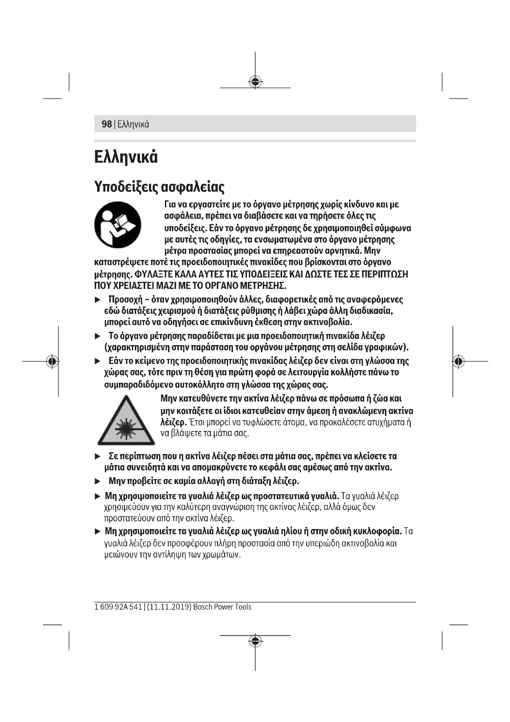 Υποδείξεις ασφαλείας Για να εργαστείτε με το όργανο μέτρησης χωρίς κίνδυνο και με ασφάλεια, πρέπει να διαβάσετε και να τηρήσετε όλες τις υποδείξεις. Εάν το όργανο μέτρησης δε χρησιμοποιηθεί σύμφωνα με αυτές τις οδηγίες, τα ενσωματωμένα στο όργανο μέτρησης μέτρα προστασίας μπορεί να επηρεαστούν αρνητικά. Μην καταστρέψετε ποτέ τις προειδοποιητικές πινακίδες που βρίσκονται στο όργανο μέτρησης. ΦΥΛΑΞΤΕ ΚΑΛΑ ΑΥΤΕΣ ΤΙΣ ΥΠΟΔΕΙΞΕΙΣ ΚΑΙ ΔΩΣΤΕ ΤΕΣ ΣΕ ΠΕΡΙΠΤΩΣΗ ΠΟΥ ΧΡΕΙΑΣΤΕΙ ΜΑΖΙ ΜΕ ΤΟ ΟΡΓΑΝΟ ΜΕΤΡΗΣΗΣ. u Προσοχή – όταν χρησιμοποιηθούν άλλες, διαφορετικές από τις αναφερόμενες εδώ διατάξεις χειρισμού ή διατάξεις ρύθμισης ή λάβει χώρα άλλη διαδικασία, μπορεί αυτό να οδηγήσει σε επικίνδυνη έκθεση στην ακτινοβολία. u Το όργανο μέτρησης παραδίδεται με μια προειδοποιητική πινακίδα λέιζερ (χαρακτηρισμένη στην παράσταση του οργάνου μέτρησης στη σελίδα γραφικών). u Εάν το κείμενο της προειδοποιητικής πινακίδας λέιζερ δεν είναι στη γλώσσα της χώρας σας, τότε πριν τη θέση για πρώτη φορά σε λειτουργία κολλήστε πάνω το συμπαραδιδόμενο αυτοκόλλητο στη γλώσσα της χώρας σας. Μην κατευθύνετε την ακτίνα λέιζερ πάνω σε πρόσωπα ή ζώα και μην κοιτάξετε οι ίδιοι κατευθείαν στην άμεση ή ανακλώμενη ακτίνα λέιζερ. Έτσι μπορεί να τυφλώσετε άτομα, να προκαλέσετε ατυχήματα ή να βλάψετε τα μάτια σας. u Σε περίπτωση που η ακτίνα λέιζερ πέσει στα μάτια σας, πρέπει να κλείσετε τα μάτια συνειδητά και να απομακρύνετε το κεφάλι σας αμέσως από την ακτίνα. u Μην προβείτε σε καμία αλλαγή στη διάταξη λέιζερ. u Μη χρησιμοποιείτε τα γυαλιά λέιζερ ως προστατευτικά γυαλιά. Τα γυαλιά λέιζερ χρησιμεύουν για την καλύτερη αναγνώριση της ακτίνας λέιζερ, αλλά όμως δεν προστατεύουν από την ακτίνα λέιζερ. u Μη χρησιμοποιείτε τα γυαλιά λέιζερ ως γυαλιά ηλίου ή στην οδική κυκλοφορία. Τα γυαλιά λέιζερ δεν προσφέρουν πλήρη προστασία από την υπεριώδη ακτινοβολία και μειώνουν την αντίληψη των χρωμάτων. 1 609 92A 541 | (11.11.2019) Bosch Power ToolsΕλληνικά | 99 u Αναθέστε την επισκευή του οργάνου μέτρησης μόνο σε ειδικευμένο τεχνικό προσωπικό και μόνο με γνήσια ανταλλακτικά. Μ’ αυτόν τον τρόπο εξασφαλίζεται η διατήρηση της ασφαλούς λειτουργίας του εργαλείου μέτρησης. u Μην αφήσετε παιδιά χωρίς επιτήρηση να χρησιμοποιήσουν το όργανο μέτρησης λέιζερ. Θα μπορούσαν ακούσια να τυφλώσουν άτομα. u Μην εργάζεστε με το όργανο μέτρησης σε επικίνδυνο για έκρηξη περιβάλλον, στο οποίο βρίσκονται εύφλεκτα υγρά, αέρια ή εύφλεκτες σκόνες. Στο εσωτερικό του εργαλείου μέτρησης μπορεί να δημιουργηθεί σπινθηρισμός κι έτσι να αναφλεχθούν η σκόνη ή οι αναθυμιάσεις. Μη φέρετε τον μαγνήτη κοντά σε εμφυτεύματα ή άλλες ιατρικές συσκευές, όπως π.χ. βηματοδότης καρδιάς ή αντλία ινσουλίνης. Από τον μαγνήτηδημιουργείται ένα πεδίο, το οποίο μπορεί να θέσει σε κίνδυνο τη λειτουργία των εμφυτευμάτων ή των ιατρικών συσκευών. u Κρατήστε το όργανο μέτρησης μακριά από μαγνητικούς φορείς δεδομένων και μαγνητικές ευαίσθητες συσκευές. Η επίδραση των μαγνητών μπορεί οδηγήσει σε οριστική απώλεια των δεδομένων. Περιγραφή προϊόντος και ισχύος Προσέξτε παρακαλώ τις εικόνες στο μπροστινό μέρος των οδηγιών λειτουργίας. Χρήση σύμφωνα με τον προορισμό Το όργανο μέτρησης προορίζεται για τον προσδιορισμό και τον έλεγχο οριζόντιων και κάθετων γραμμών καθώς και σημείων κατακορύφου. Το εργαλείο μέτρησης είναι κατάλληλο για χρήση σε εσωτερικούς χώρους. Απε