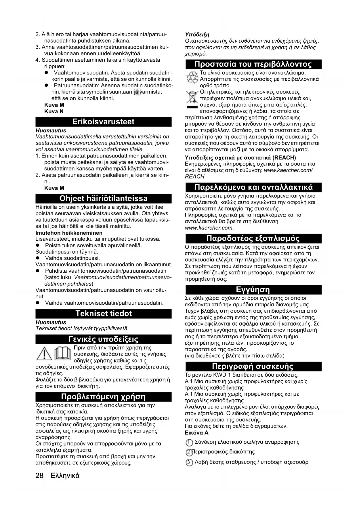 ni. Kuva M Ohjeet häiriötilanteissa Häiriöillä on usein yksinkertaisia syitä, jotka voit itse poistaa seuraavan yleiskatsauksen avulla. Ota yhteys valtuutettuun asiakaspalveluun epäselvissä tapauksis- sa tai jos häiriöitä ei ole tässä mainittu. Imutehon heikkeneminen Lisävarusteet, imuletku tai imuputket ovat tukossa. Poista tukos soveltuvalla apuvälineellä. Suodatinpussi on täynnä. Vaihda suodatinpussi. Vaahtomuovisuodatin/patruunasuodatin on likaantunut. Puhdista vaahtomuovisuodatin/patruunasuodatin (katso luku Vaahtomuovisuodattimen/patruunasuo- dattimen puhdistus). Vaahtomuovisuodatin/patruunasuodatin on vaurioitu- nut. Vaihda vaahtomuovisuodatin/patruunasuodatin. Tekniset tiedot Huomautus Tekniset tiedot löytyvät tyyppikilvestä. Γενικές υποδείξεις Πριν από την πρώτη χρήση της συσκευής, διαβάστε αυτές τις γνήσιες οδηγίες χρήσης καθώς και τις συνοδευτικές υποδείξεις ασφαλείας. Εφαρμόζετε αυτές τις οδηγίες. Φυλάξτε τα δύο βιβλιαράκια για μεταγενέστερη χρήση ή για τον επόμενο ιδιοκτήτη. Προβλεπόμενη χρήση Χρησιμοποιείτε τη συσκευή αποκλειστικά για την ιδιωτική σας κατοικία. Η συσκευή προορίζεται για χρήση όπως περιγράφεται στις παρούσες οδηγίες χρήσης και τις υποδείξεις ασφαλείας ως ηλεκτρική σκούπα ξηρής και υγρής αναρρόφησης. Οι στάχτες μπορούν να απορροφούνται μόνο με τα κατάλληλα εξαρτήματα. Προστατέψτε τη συσκευή από βροχή και μην την αποθηκεύσετε σε εξω τερικούς χώ