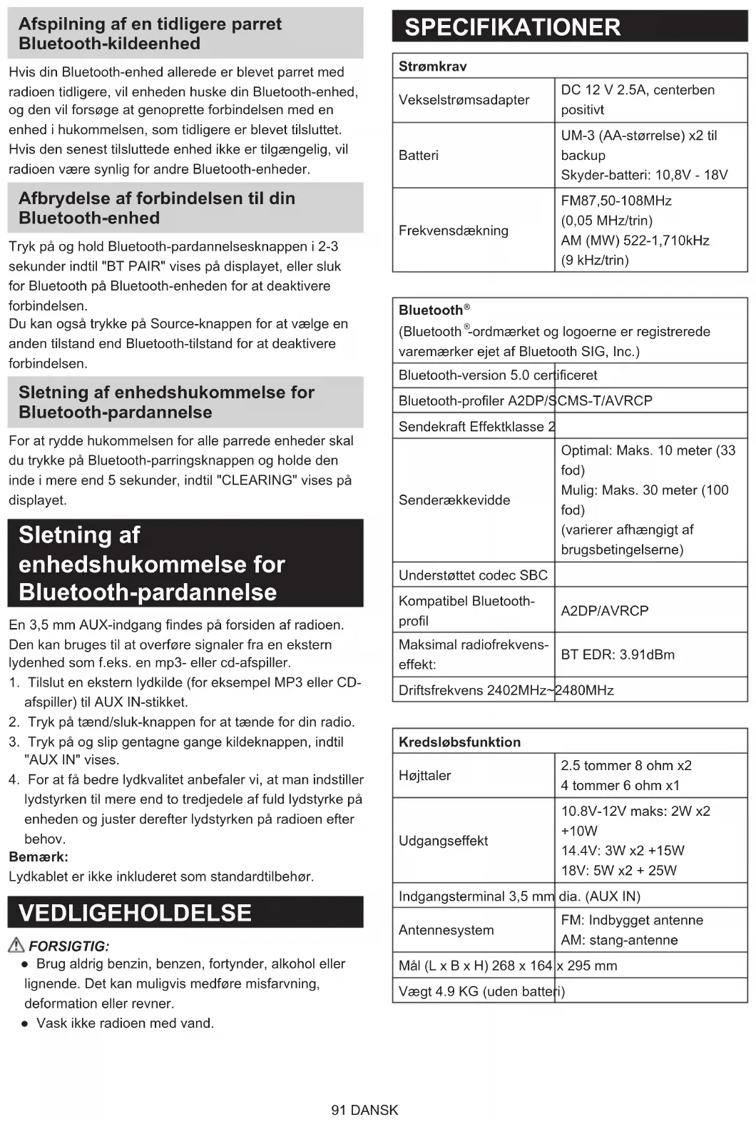 Συρόμενη μπαταρία: 10.8V - 18V Συχνότητας κάλυψης FM87,50-108MHz (0,05MHz/βήμα) AM(MW)522-1,710kHz (9 kHz/βήμα) Bluetooth