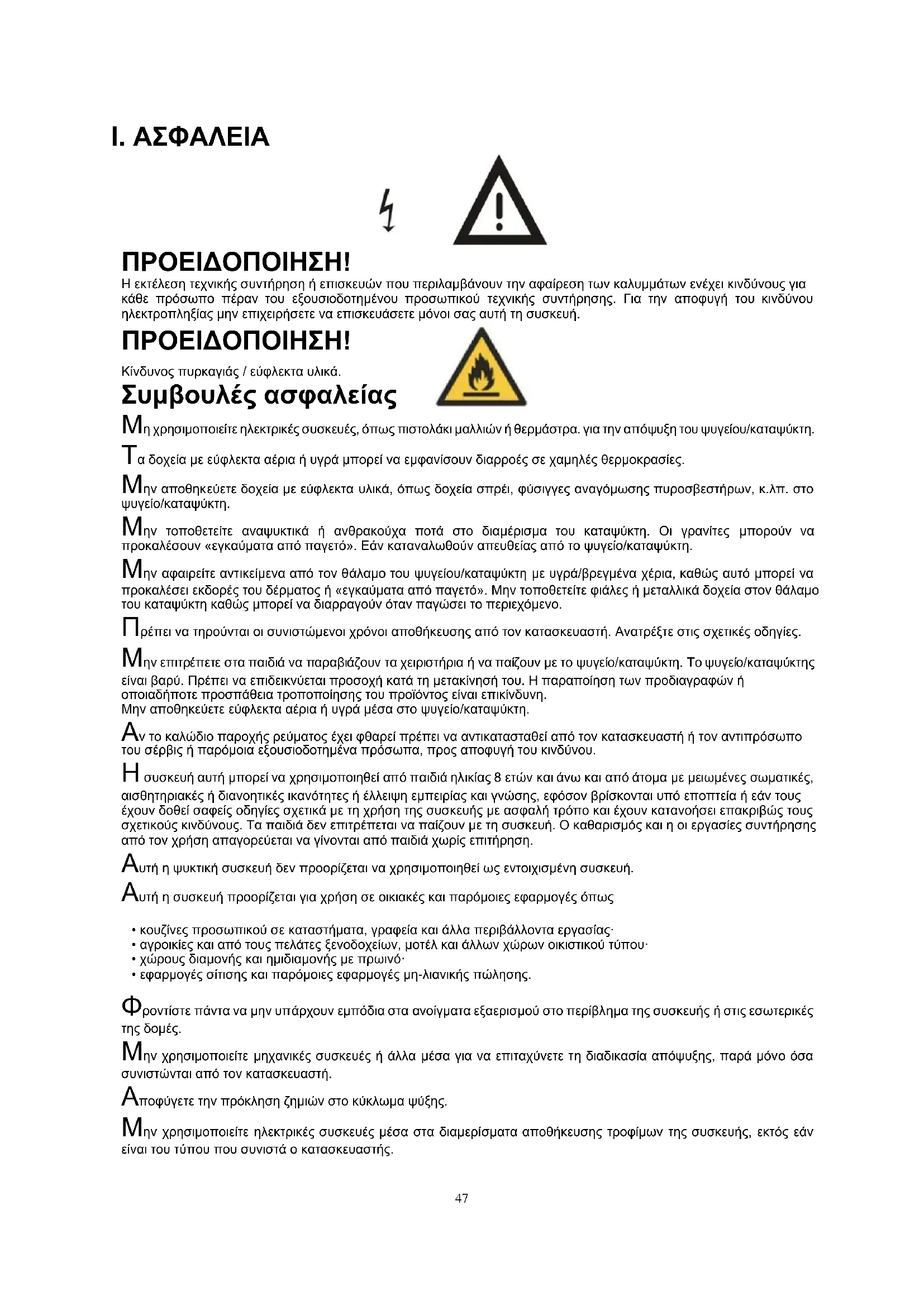 Μην χρησιμοποιείτε μηχανικές συσκευές ή άλλα μέσα για να επιταχύνετε τη διαδικασία απόψυξης, παρά μόνο όσα συνιστώνται από τον κατασκευαστή. Αποφύγετε την πρόκληση ζημιών στο κύκλωμα ψύξης. Μην χρησιμοποιείτε ηλεκτρικές συσκευές μέσα στα διαμερίσματα αποθήκευσης τροφίμων της συσκευής, εκτός εάν είναι του τύπου που συνιστά ο κατασκευαστής.48 Μην αποθηκεύετε εκρηκτικές ουσίες όπως δοχεία αερολύματος με εύφλεκτο περιεχόμενο σε αυτή τη συσκευή. Αυτή η συσκευή δεν προορίζεται για χρήση από άτομα (συμπεριλαμβανομένων των παιδιών) με μειωμένες φυσικές, κινητικές ή διανοητικές ικανότητες ή χωρίς εμπειρία και γνώσεις, εκτός και εάν εποπτεύονται ή έχουν λάβει οδηγίες αναφορικά με τη χρήση της συσκευής από πρόσωπο υπεύθυνο για την ασφάλειά τους. Τα παιδιά πρέπει να εποπτεύονται συνεχώς ώστε να διασφαλιστεί ότι δεν παίζουν με τη συσκευή. – ΠΡΟΕΙΔΟΠΟΙΗΣΗ: Φροντίστε πάντα να μην υπάρχουν εμπόδια στα ανοίγματα εξαερισμού στο περίβλημα της συσκευής ή στις εσωτερικές της δομές. – ΠΡΟΕΙΔΟΠΟΙΗΣΗ: Μην χρησιμοποιείτε μηχανικές συσκευές ή άλλα μέσα για να επιταχύνετε τη διαδικασία απόψυξης, παρά μόνο όσα συνιστώνται από τον κατασκευαστή. – ΠΡΟΕΙΔΟΠΟΙΗΣΗ: Αποφύγετε την πρόκληση ζημιών στο κύκλωμα ψύξης. – ΠΡΟΕΙΔΟΠΟΙΗΣΗ: Μην χρησιμοποιείτε ηλεκτρικές συσκευές μέσα στα διαμερίσματα αποθήκευσης τροφίμων της συσκευής, εκτός εάν είναι του τύπου που συνιστά ο κατασκευαστής. – ΠΡΟΕΙΔΟΠΟΙΗΣΗ: Οι ψυκτικές συσκευές και ιδιαίτερα ο ψυγειοκαταψύκτης τύπου Ι, ενδέχεται να μην λειτουργούν με συνέπεια (πιθανότητα απόψυξης του περιεχομένου ή να ανέβει η θερμοκρασία και να γίνει πολύ ζεστή στο χώρο των κατεψυγμένων τροφίμων) όταν έχει ρυθμιστεί για μεγάλο χρονικό διάστημα κάτω από το όριο ψύχους του εύρους των θερμοκρασιών οι οποίες έχουν σχεδιαστεί για την ψυκτική συσκευή. – ΠΡΟΕΙΔΟΠΟΙΗΣΗ: Είναι αναγκαίο, επίσης, οι πόρτες ή τα καλύμματα να είναι εφοδιασμένα με κλειδαριές και κλειδιά, με τα κλειδιά αυτά να πρέπει να φυλάσσονται μακριά από παιδιά και όχι κοντά στην ψυκτική συσκευή, προκειμένου να αποφευχθεί το κλείδωμα των παιδιών. – ΠΡΟΕΙΔΟΠΟΙΗΣΗ: Το ψυκτικό υγρό και τα μονωτικά υλικά που χρησιμοποιούνται στη συσκευή απαιτούν ειδικές διαδικασίες απόρριψης. – ΠΡΟΕΙΔΟΠΟΙΗΣΗ: Κατά την τοποθέτηση της συσκευής διασφαλίστε ότι το καλώδιο τροφοδοσίας δεν έχει παγιδευτεί ή υποστεί ζημιά. – ΠΡΟΕΙΔΟΠΟΙΗΣΗ: Μην τοποθετείτε πολλαπλές φορητές πρίζες ή φορητά τροφοδοτικά στο πίσω μέρος της συσκευής Τα παιδιά ηλικίας από 3 έως 8 ετών επιτρέπεται να φορτώνουν και να ξεφορτώνουν τις ψυκτικές συσκευές. Για την αποφυγή της μόλυνσης των τροφίμων, ακολουθήστε τις παρακάτω οδηγίες: – Το άνοιγμα της πόρτας για μεγάλα (χρονικά) διαστήματα μπορεί να προκαλέσει σημαντική αύξηση της θερμοκρασίας στους θαλάμους της συσκευής. – Καθαρίζετε τακτικά τις επιφάνειες που έρχονται σε επαφή με τρόφιμα και προσβάσιμα συστήματα αποστράγγισης. – Καθαρίζετε τα δοχεία νερού, εάν δεν έχουν χρησιμοποιηθεί για 48 ώρες. Ξεπλύνετε το σύστημα νερού που συνδέεται σε παροχή νερού, εάν δεν έχει εκτελεστεί άντληση νερού για 5 ημέρες. – Αποθηκεύετε το ωμό κρέας και τα ψάρια σε κατάλληλα δοχεία στο ψυγείο, ώστε να μην έρχονται σε επαφή και να μην στάζουν επάνω σε άλλα τρόφιμα. – Οι θάλαμοι κατεψυγμένων τροφίμων δύο αστέρων είναι κατάλληλοι για την αποθήκευση προ-κατεψυγμένων τροφίμων, την αποθήκ