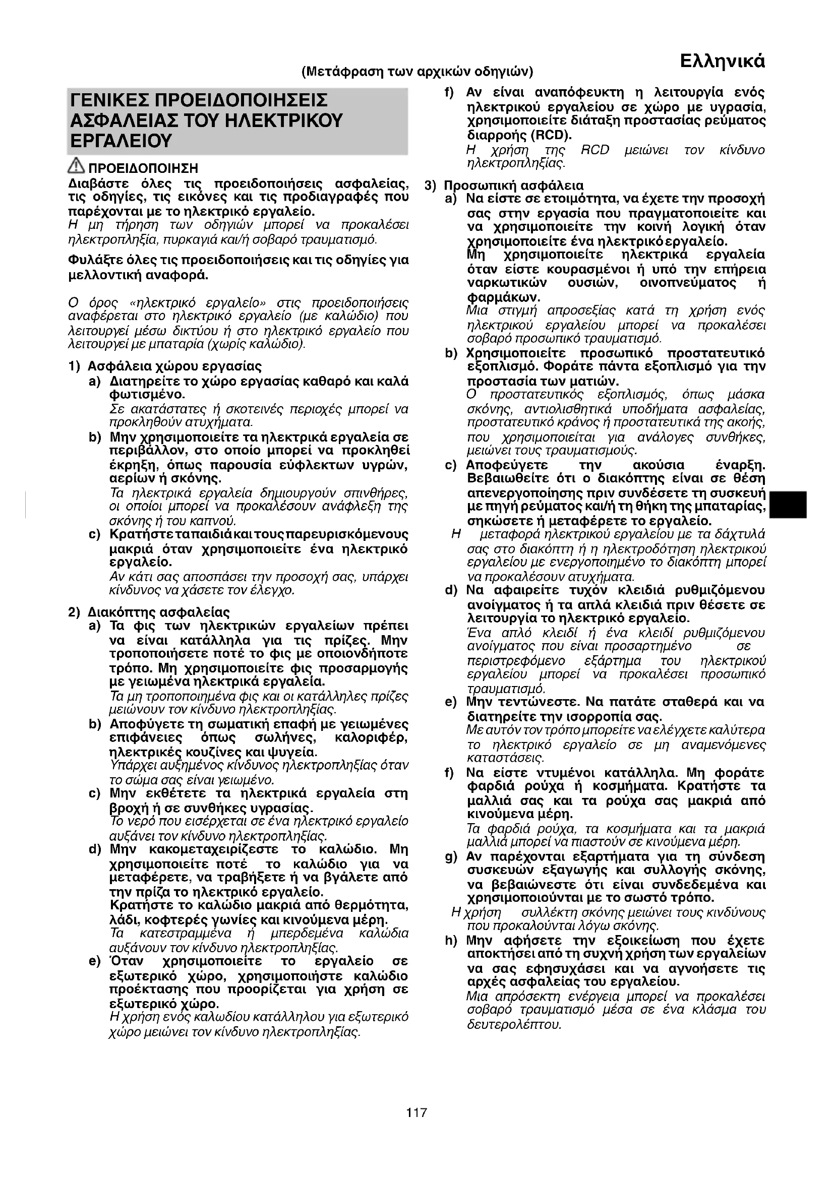 συλλέκτη σκόνης μειώνει τους κινδύνους που προκαλούνται λόγω σκόνης. h) Μην αφήσετε την εξοικείωση που έχετε αποκτήσει από τη συχνή χρήση των εργαλείων να σας εφησυχάσει και να αγνοήσετε τις αρχές ασφαλείας του εργαλείου. Μια απρόσεκτη ενέργεια μπορεί να προκαλέσει σοβαρό τραυματισμό μέσα σε ένα κλάσμα του δευτερολέπτου. ΓΕΝΙΚΕΣ ΠΡΟΕΙΔΟΠΟΙΗΣΕΙΣ ΑΣΦΑΛΕΙΑΣ ΤΟΥ ΗΛΕΚΤΡΙΚΟΥ