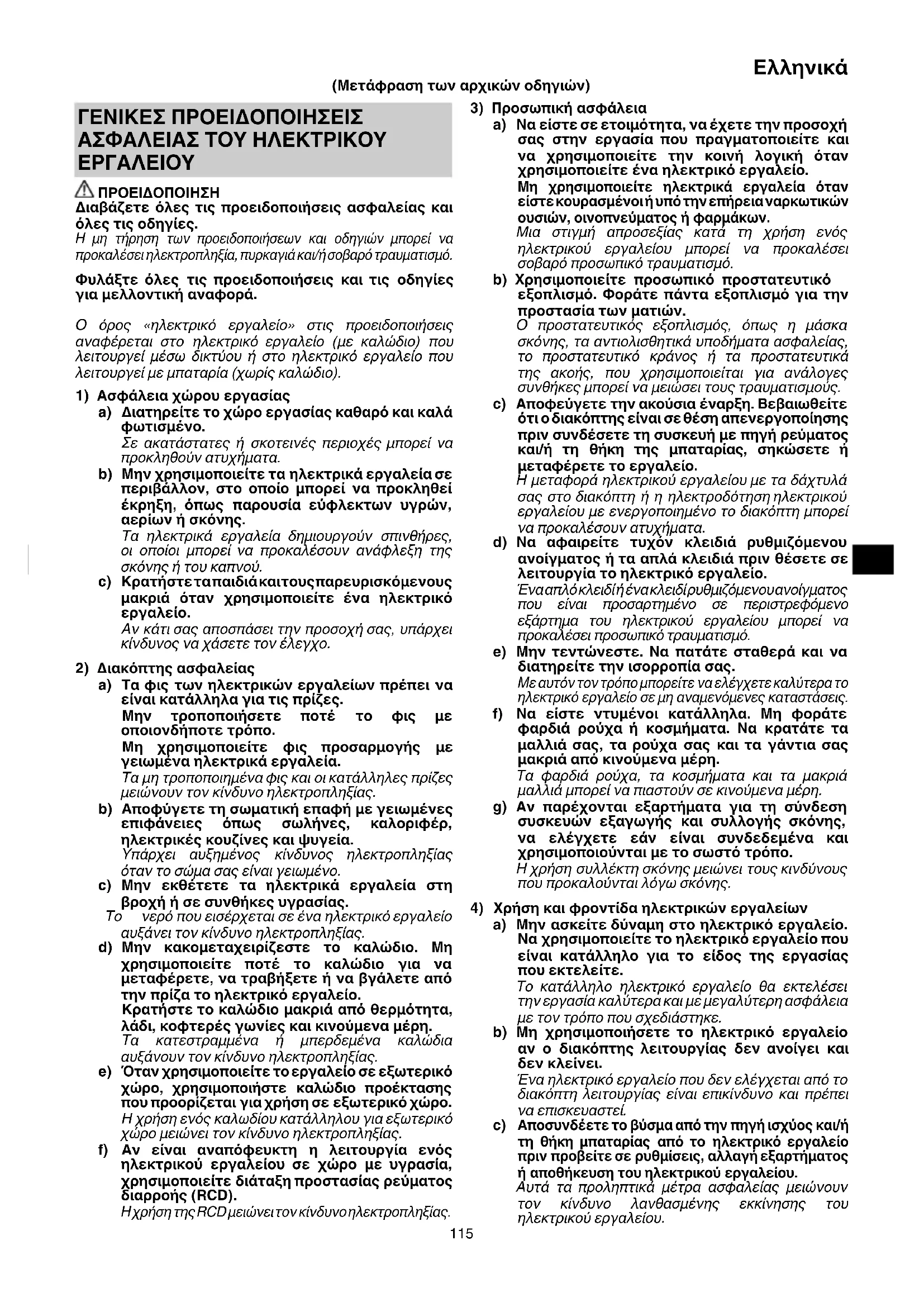 ΠΡΟΕΙΔΟΠΟΙΗΣΗ Διαβάζετε όλες τις προειδοποιήσεις ασφαλείας και όλες τις οδηγίες. Η μη τήρηση των προειδοποιήσεων και οδηγιών μπορεί να προκαλέσει ηλεκτροπληξία, πυρκαγιά και/ή σοβαρό τραυματισμό. Φυλάξτε όλες τις προειδοποιήσεις και τις οδηγίες για μελλοντική αναφορά. Ο όρος «ηλεκτρικό εργαλείο» στις προειδοποιήσεις αναφέρεται στο ηλεκτρικό εργαλείο (με καλώδιο) που λειτουργεί μέσω δικτύου ή στο ηλεκτρικό εργαλείο που λειτουργεί με μπαταρία (χωρίς καλώδιο).