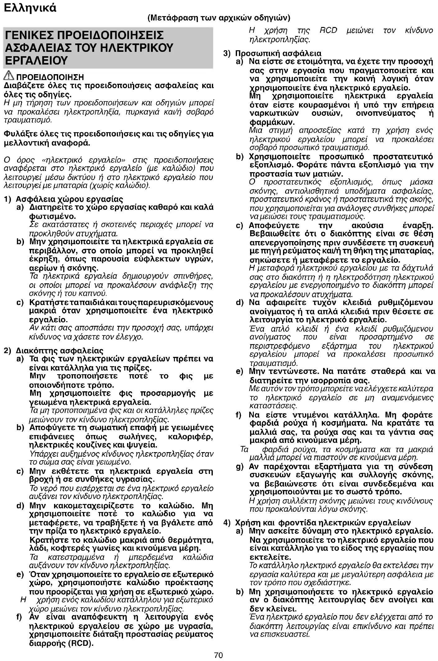 χρήση ενός καλωδίου κατάλληλου για εξωτερικό χώρο μειώνει τον κίνδυνο ηλεκτροπληξίας. f) Αν είναι αναπόφευκτη η λειτουργία ενός ηλεκτρικού εργαλείου σε χώρο με υγρασία, χρησιμοποιείτε διάταξη προστασίας ρεύματος διαρροής (RCD). (Μετάφραση των αρχικών οδηγιών) 0000BookG12VA.indb700000BookG12VA.indb70 2017/11/2912:09:272017/11/2912:09:2771