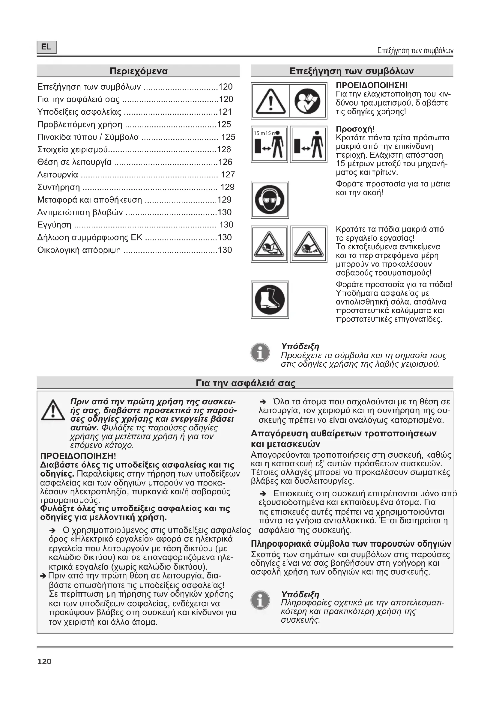 - Οικολογική απόρριψη Επεξήγηση των συμβόλων ΠΡΟΕΙΔΟΠΟΙΗΣΗ! Για την ελαχιστοποίηση του κιν- δύνου τραυματισμού, διαβάστε τις οδηγίες χρήσης! 15 m15 m p. 130