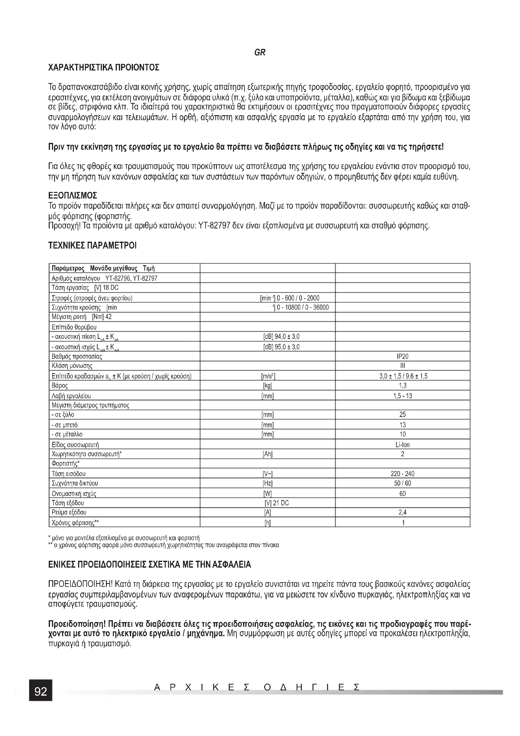 - μόνο για μοντέλα εξοπλισμένα με συσσωρευτή και φορτιστή ** ο χρόνος φόρτισης αφορά μόνο συσσωρευτή χωρητικότητας που αναγράφεται στον πίνακα ΕΝΙΚΕΣ ΠΡΟΕΙΔΟΠΟΙΗΣΕΙΣ ΣΧΕΤΙΚΑ ΜΕ ΤΗΝ ΑΣΦΑΛΕΙΑ ΠΡΟΕΙΔΟΠΟΙΗΣΗ! Κατά τη διάρκεια της εργασίας με το εργαλείο συνιστάται να τηρείτε πάντα τους βασικούς κανόνες ασφαλείας εργασίας συμπεριλαμβανομένων των αναφερομένων παρακάτω, για να μειώσετε τον κίνδυνο πυρκαγιάς, ηλεκτροπληξίας και να αποφύγετε τραυματισμούς. Προειδοποίηση! Πρέπει να διαβάσετε όλες τις προειδοποιήσεις ασφαλείας, τις εικόνες και τις προδιαγραφές που παρέ- χονται με αυτό το ηλεκτρικό εργαλείο / μηχάνημα. Μη συμμόρφωση με αυτές οδηγίες μπορεί να προκαλέσει ηλεκτροπληξία, πυρκαγιά ή τραυματισμό.93 ΑΡΧΙΚΕΣ ΟΔΗΓΙΕΣ