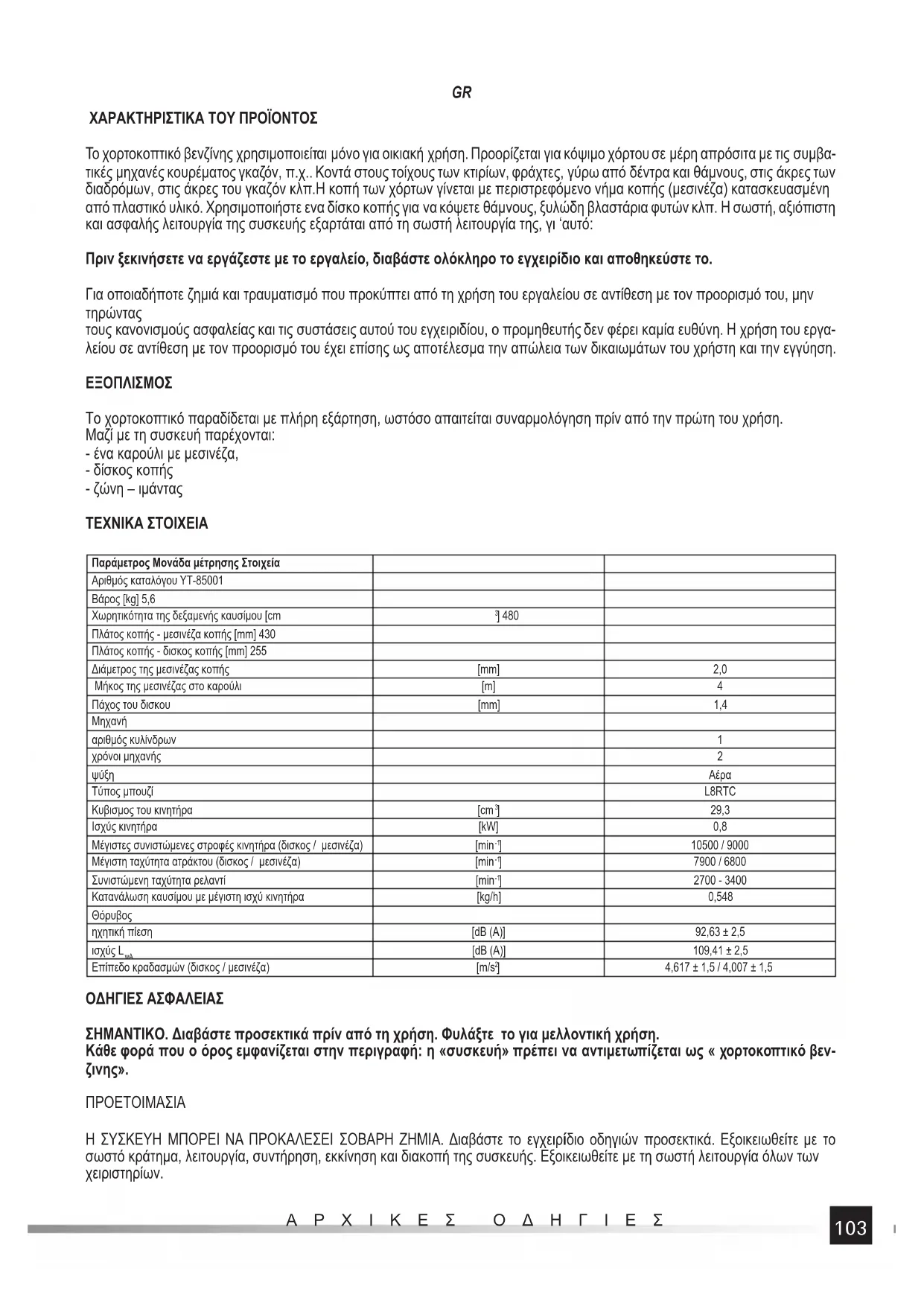 ΠΡΟΕΤΟΙΜΑΣΙΑ Η ΣΥΣΚΕΥΗ ΜΠΟΡΕΙ ΝΑ ΠΡΟΚΑΛΕΣΕΙ ΣΟΒΑΡΗ ΖΗΜΙΑ. Διαβάστε το εγχειρίδιο οδηγιών προσεκτικά. Εξοικειωθείτε με το σωστό κράτημα, λειτουργία, συντήρηση, εκκίνηση και διακοπή της συσκευής. Εξοικειωθείτε με τη σωστή λειτουργία όλων των χειριστηρίων.104