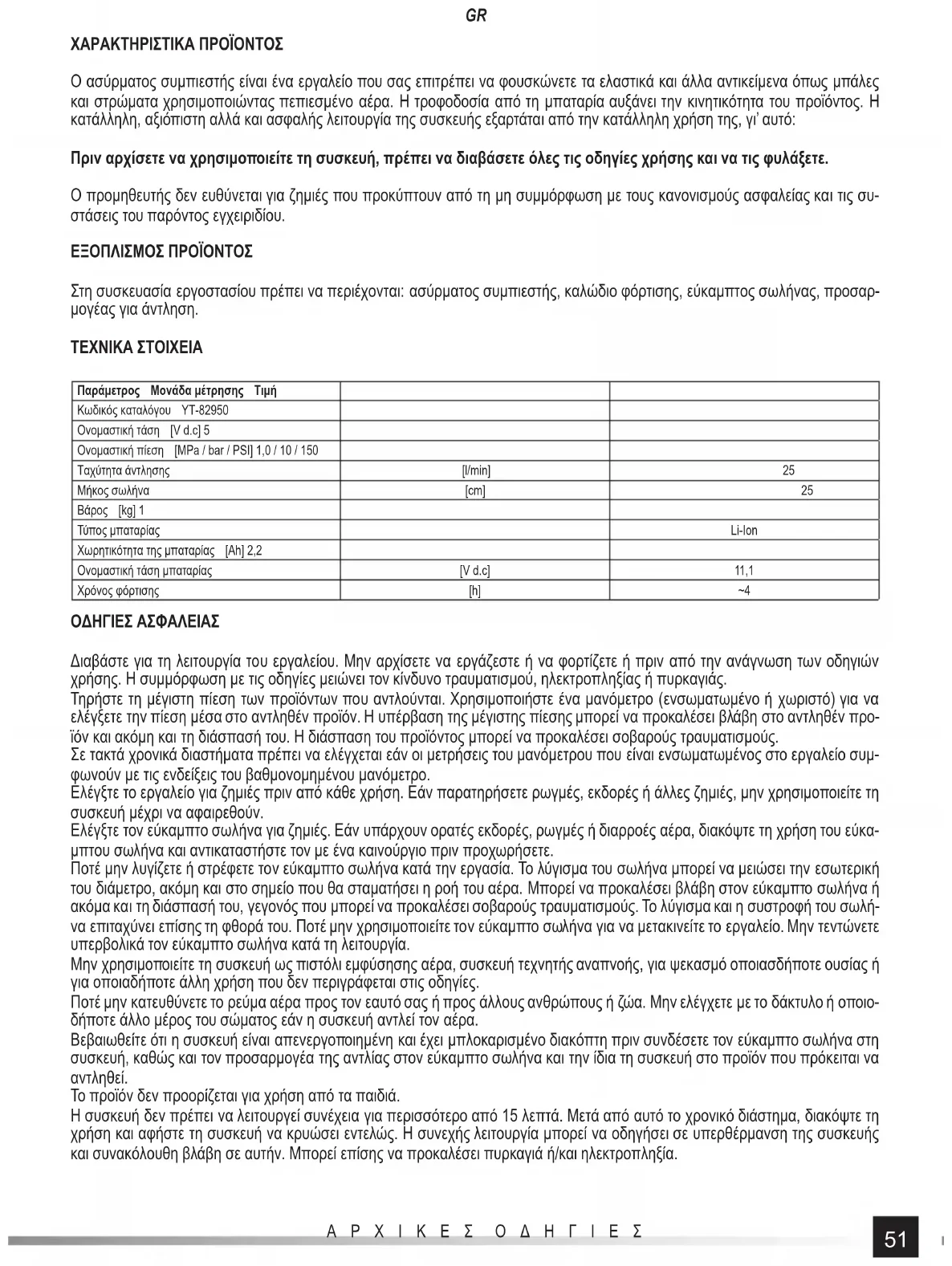 ΑΡΧΙΚΕΣ ΟΔΗΓΙΕΣ ΧΑΡΑΚΤΗΡΙΣΤΙΚΑ ΠΡΟΪΟΝΤΟΣ Ο ασύρματος συμπιεστής είναι ένα εργαλείο που σας επιτρέπει να φουσκώνετε τα ελαστικά και άλλα αντικείμενα όπως μπάλες και στρώματα χρησιμοποιώντας πεπιεσμένο αέρα. Η τροφοδοσία από τη μπαταρία αυξάνει την κινητικότητα του προϊόντος. Η κατάλληλη, αξιόπιστη αλλά και ασφαλής λειτουργία της συσκευής εξαρτάται από την κατάλληλη χρήση της, γι’ αυτό: Πριν αρχίσετε να χρησιμοποιείτε τη συσκευή, πρέπει να διαβάσετε όλες τις οδηγίες χρήσης και να τις φυλάξετε. Ο προμηθευτής δεν ευθύνεται για ζημιές που προκύπτουν από τη μη συμμόρφωση με τους κανονισμούς ασφαλείας και τις συ- στάσεις του παρόντος εγχειριδίου. ΕΞΟΠΛΙΣΜΟΣ ΠΡΟΪΟΝΤΟΣ Στη συσκευασία εργοστασίου πρέπει να περιέχονται: ασύρματος συμπιεστής, καλώδιο φόρτισης, εύκαμπτος σωλήνας, προσαρ- μογέας για άντληση. ΤΕΧΝΙΚΑ ΣΤΟΙΧΕΙΑ Παράμετρος Μονάδα μέτρησης Τιμή Κωδικός καταλόγου YT-82950 Ονομαστική τάση [V d.c] 5 Ονομαστική πίεση [MPa / bar / PSI] 1,0 / 10 / 150 Ταχύτητα άντλησης [l/min] 25 Μήκος σωλήνα [cm] 25 Βάρος [kg] 1 Τύπος μπαταρίας Li-Ion Χωρητικότητα της μπαταρίας [Ah] 2,2 Ονομαστική τάση μπαταρίας [V d.c] 11,1 Χρόνος φόρτισης [h] ~4 ΟΔΗΓΙΕΣ ΑΣΦΑΛΕΙΑΣ Διαβάστε για τη λειτουργία του εργαλείου. Μην αρχίσετε να εργάζεστε ή να φορτίζετε ή πριν από την ανάγνωση των οδηγιών χρήσης. Η συμμόρφωση με τις οδηγίες μειώνει τον κίνδυνο τραυματισμού, ηλεκτροπληξίας ή πυρκαγιάς. Τηρήστε τη μέγιστη πίεση των προϊόντων που αντλούνται. Χρησιμοποιήστε ένα μανόμετρο (ενσωματωμένο ή χωριστό) για να ελέγξετε την πίεση μέσα στο αντληθέν προϊόν. Η υπέρβαση της μέγιστης πίεσης μπορεί να προκαλέσει βλάβη στο αντληθέν προ- ϊόν και ακόμη και τη διάσπασή του. Η διάσπαση του προϊόντος μπορεί να προκαλέσει σοβαρούς τραυματισμούς. Σε τακτά χρονικά διαστήματα πρέπει να ελέγχεται εάν οι μετρήσεις του μανόμετρου που είναι ενσωματωμένος στο εργαλείο συμ- φωνούν με τις ενδείξεις του βαθμονομημένου μανόμετρο. Ελέγξτε το εργαλείο για ζημιές πριν από κάθε χρήση. Εάν παρατηρήσετε ρωγμές, εκδορές ή άλλες ζημιές, μην χρησιμοποιείτε τη συσκευή μέχρι να αφαιρεθούν. Ελέγξτε τον εύκαμπτο σωλήνα για ζημιές. Εάν υπάρχουν ορατές εκδορές, ρωγμές ή διαρροές αέρα, διακόψτε τη χρήση του εύκα- μπτου σωλήνα και αντικαταστήστε τον με ένα καινούργιο πριν προχωρήσετε. Ποτέ μην λυγίζετε ή στρέφετε τον εύκαμπτο σωλήνα κατά την εργασία. Το λύγισμα του σωλήνα μπορεί να μειώσει την εσωτερική του διάμετρο, ακόμη και στο σημείο που θα σταματήσει η ροή του αέρα. Μπορεί να προκαλέσει βλάβη στον εύκαμπτο σωλήνα ή ακόμα και τη διάσπασή του, γεγονός που μπορεί να προκαλέσει σοβαρούς τραυματισμούς. Το λύγισμα και η συστροφή του σωλή- να επιταχύνει επίσης τη φθορά του. Ποτέ μην χρησιμοποιείτε τον εύκαμπτο σωλήνα για να μετακινείτε το εργαλείο. Μην τεντώνετε υπερβολικά τον εύκαμπτο σωλήνα κατά τη λειτουργία. Μην χρησιμοποιείτε τη συσκευή ως πιστόλι εμφύσησης αέρα, συσκευή τεχνητής αναπνοής, για ψεκασμό οποιασδήποτε ουσίας ή για οποιαδήποτε άλλη χρήση που δεν περιγράφεται στις οδηγίες. Ποτέ μην κατευθύνετε το ρεύμα αέρα προς τον εαυτό σας ή προς άλλους ανθρώπους ή ζώα. Μην ελέγχετε με το δάκτυλο ή οποιο- δήποτε άλλο μέρος του σώματος εάν η συσκευή αντλεί τον αέρα. Βεβαιωθείτε ότι η συσκευή είναι απενεργοποιημένη και έχει μπλοκαρισμένο διακόπτη πριν συνδέσετε τον εύκαμπτο σωλήνα στη συσκευή, καθώς και τον προσαρμογέα της αντλίας στον εύκαμπτο 