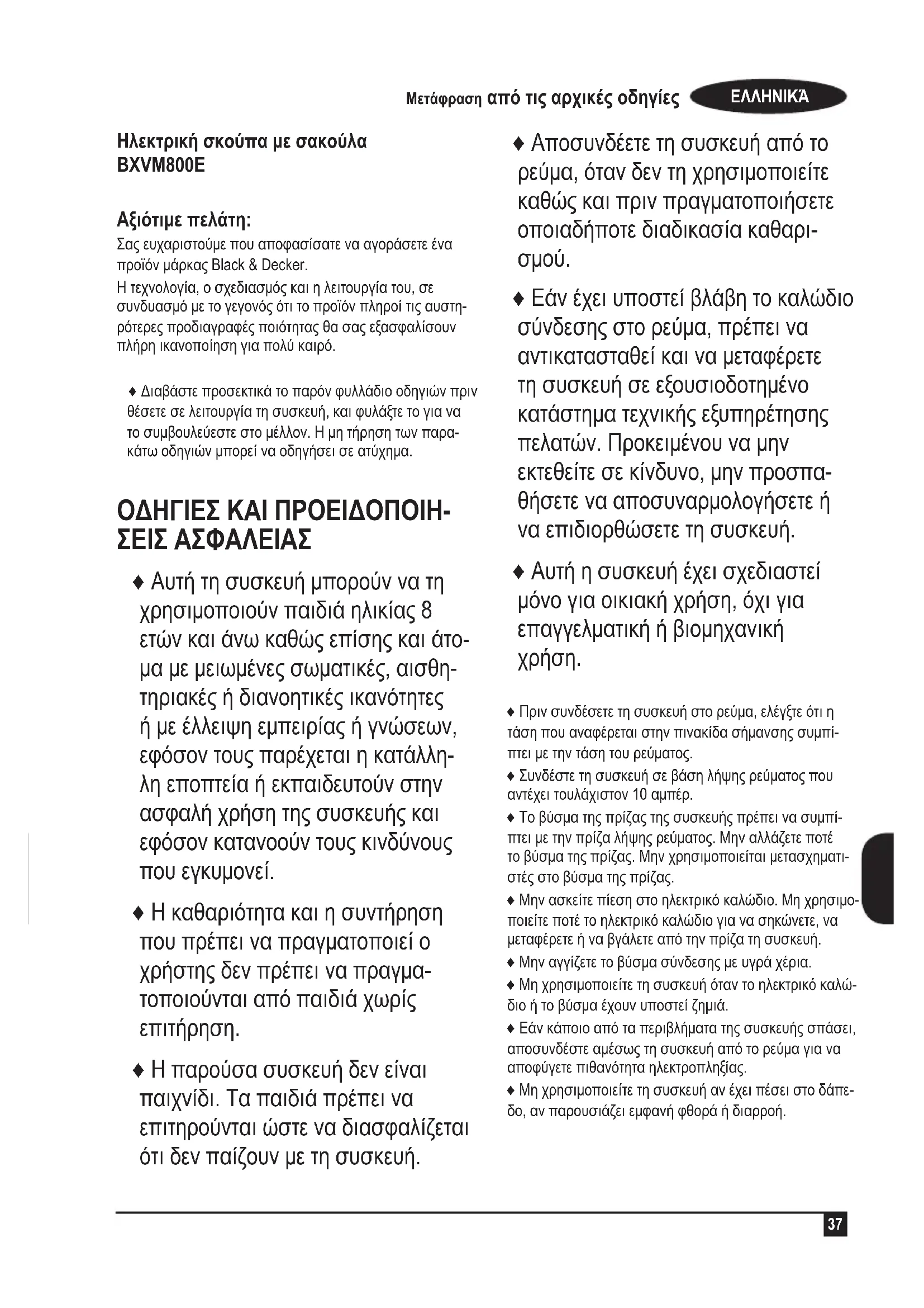 Ηλεκτρική σκούπα με σακούλα BXVM800E Αξιότιμε πελάτη: Σας ευχαριστούμε που αποφασίσατε να αγοράσετε ένα προϊόν μάρκας Black & Decker. Η τεχνολογία, ο σχεδιασμός και η λειτουργία του, σε συνδυασμό με το γεγονός ότι το προϊόν πληροί τις αυστη- ρότερες προδιαγραφές ποιότητας θα σας εξασφαλίσουν πλήρη ικανοποίηση για πολύ καιρό. ♦ Διαβάστε προσεκτικά το παρόν φυλλάδιο οδηγιών πριν θέσετε σε λειτουργία τη συσκευή, και φυλάξτε το για να το συμβουλεύεστε στο μέλλον. Η μη τήρηση των παρα- κάτω οδηγιών μπορεί να οδηγήσει σε ατύχημα. ΟΔΗΓΊΕΣ ΚΑΊ ΠΡΟΕΊΔΟΠΟΊΗ- ΣΕΊΣ ΑΣΦΑΛΕΊΑΣ ♦ Αυτή τη συσκευή μπορούν να τη χρησιμοποιούν παιδιά ηλικίας 8 ετών και άνω καθώς επίσης και άτο- μα με μειωμένες σωματικές, αισθη- τηριακές ή διανοητικές ικανότητες ή με έλλειψη εμπειρίας ή γνώσεων, εφόσον τους παρέχεται η κατάλλη- λη εποπτεία ή εκπαιδευτούν στην ασφαλή χρήση της συσκευής και εφόσον κατανοούν τους κινδύνους που εγκυμονεί. ♦ Η καθαριότητα και η συντήρηση που πρέπει να πραγματοποιεί ο χρήστης δεν πρέπει να πραγμα- τοποιούνται από παιδιά χωρίς