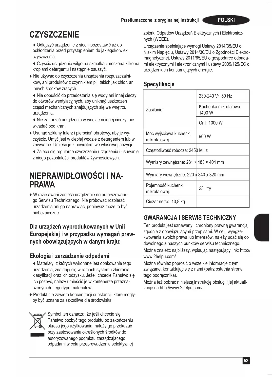23 λίτρα Καθαρό βάρος: 13,8 kg ΕΓΓΥΗΣΗ ΚΑΊ ΤΕΧΝΊΚΗ ΥΠΟΣΤΗΡΊΞΗ Το παρόν προϊόν αναγνωρίζεται και προστατεύεται από τη νόμιμη εγγύηση συμμόρφωσης προς την ισχύουσα νο- μοθεσία. Για να διεκδικήσετε τα δικαιώματα ή συμφέροντά σας πρέπει να απευθυνθείτε σε ένα από επίσημα γραφεία μας τεχνικής υποστήριξης. Θα βρείτε το πλησιέστερο, ακολουθώντας τον παρακάτω σύνδεσμο: http://www.2helpu.com/ Επίσης, μπορείτε να ζητήσετε οποιαδήποτε πληροφορίας, επικοινωνώντας μαζί μας (Κοιτάξτε την τελευταία σελίδα αυτού του εγχειριδίου). Μπορείτε να «κατεβάσετε» από το διαδίκτυο το παρόν εγχειρίδιο οδηγιών και τις σχετικές ενημερώσεις του στοhttp://www.2helpu.com/РУССКИЙ Перевод от оригинальной инструкции