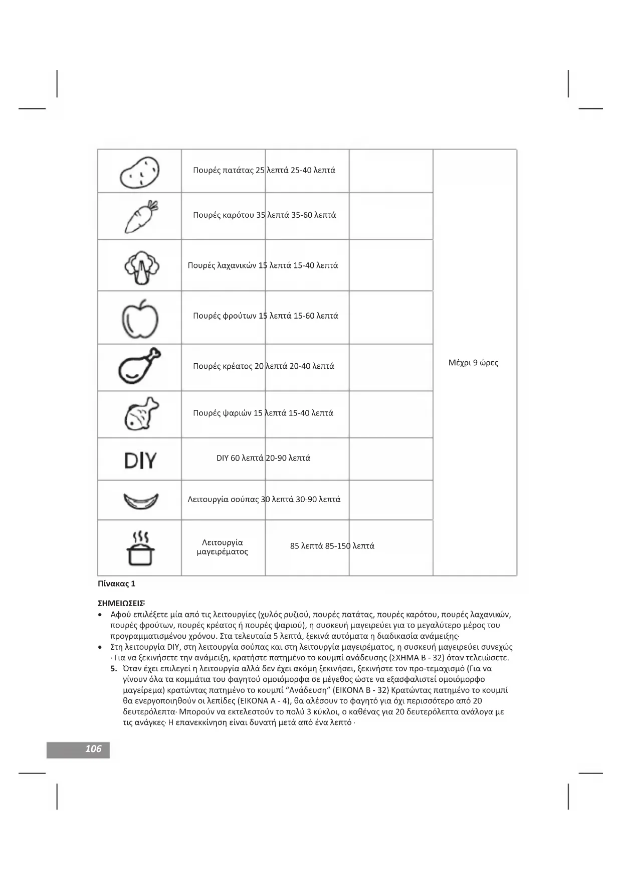 Πουρές πατάτας 25 λεπτά 25-40 λεπτά Μέχρι 9 ώρες Πουρές καρότου 35 λεπτά 35-60 λεπτά Πουρές λαχανικών 15 λεπτά 15-40 λεπτά Πουρές φρούτων 15 λεπτά 15-60 λεπτά Πουρές κρέατος 20 λεπτά 20-40 λεπτά Πουρές ψαριών 15 λεπτά 15-40 λεπτά DIY 60 λεπτά 20-90 λεπτά Λειτουργία σούπας 30 λεπτά 30-90 λεπτά