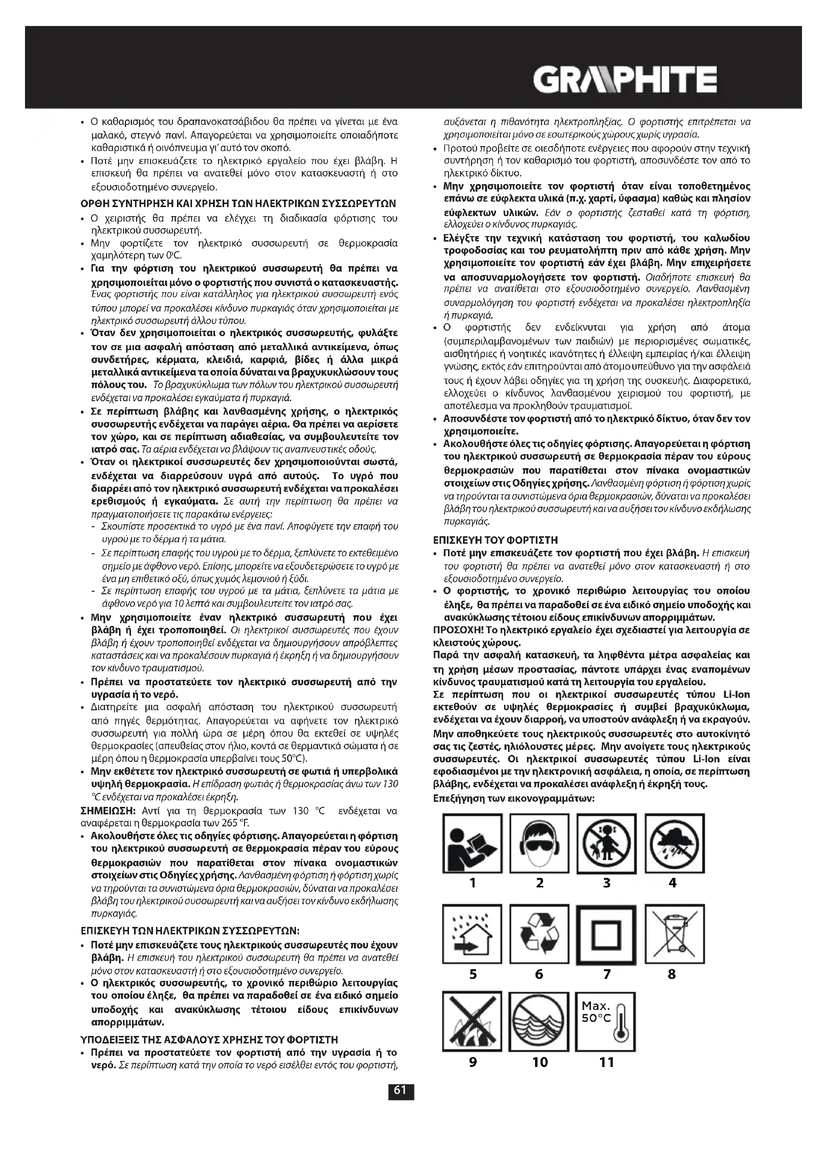 - Για την φόρτιση του ηλεκτρικού συσσωρευτή θα πρέπει να χρησιμοποιείται μόνο ο φορτιστής που συνιστά ο κατασκευαστής. Ένας φορτιστής που είναι κατάλληλος για ηλεκτρικού συσσωρευτή ενός τύπου μπορεί να προκαλέσει κίνδυνο πυρκαγιάς όταν χρησιμοποιείται με ηλεκτρικό συσσωρευτή άλλου τύπου.