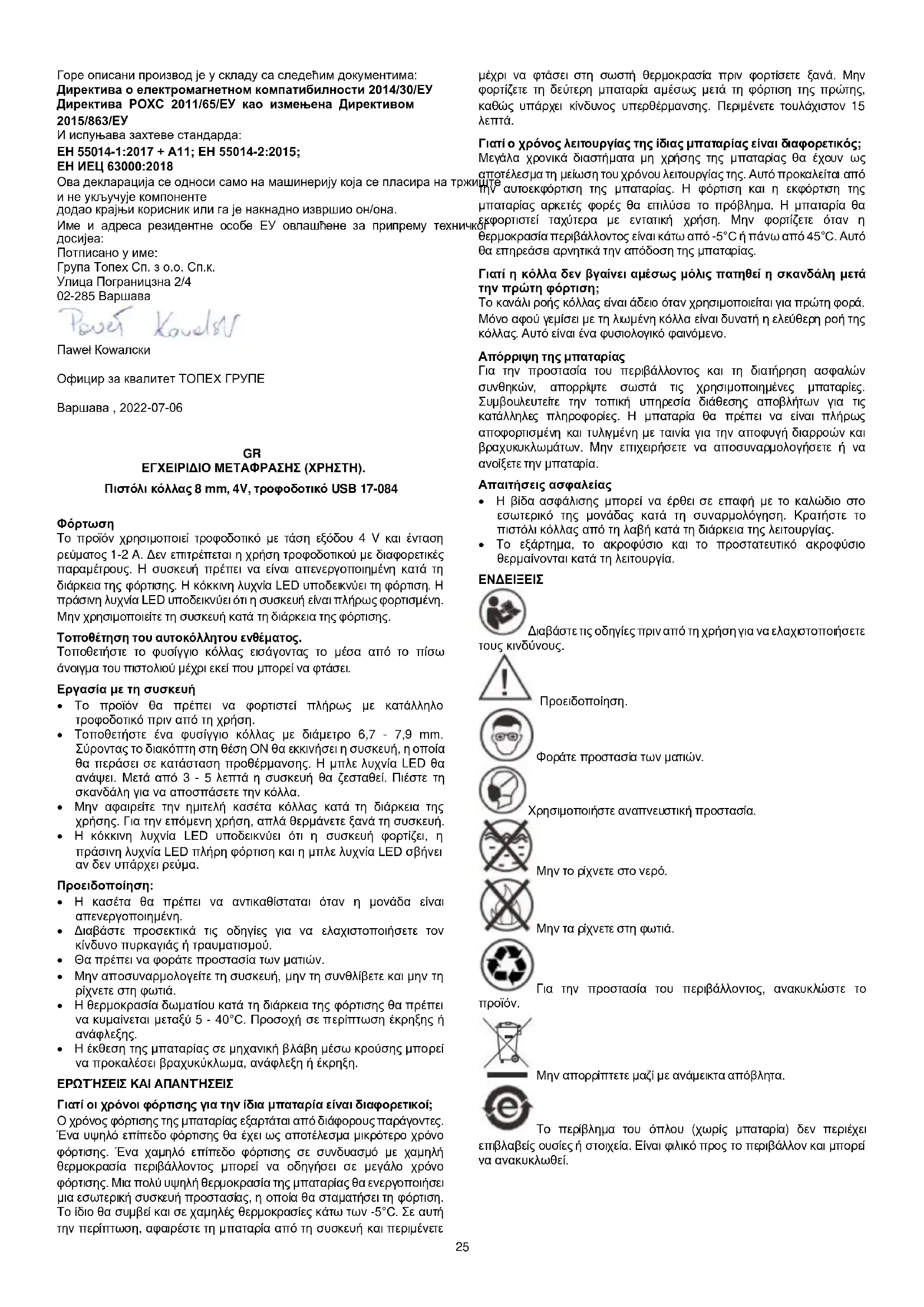 Δήλωση συμμόρφωσης ΕΕ Κατασκευαστής: Sp.k., Pograniczna 2/4 02-285 Warszawa Προϊόν: Προϊόν: Πιστόλι κόλλας Μοντέλο: 17-084 Εμπορική ονομασία: NEO TOOLS Σειριακός αριθμός: 00001 ÷ 99999 Η παρούσα δήλωση συμμόρφωσης εκδίδεται με αποκλειστική ευθύνη του κατασκευαστή. Το προϊόν που περιγράφεται ανωτέρω συμμορφώνεται με τα ακόλουθα έγγραφα: Οδηγία ηλεκτρομαγνητικής συμβατότητας 2014/30/ΕΕ Οδηγία RoHS 2011/65/ΕΕ όπως τροποποιήθηκε από την οδηγία 2015/863/ΕΕ Και πληροί τις απαιτήσεις των προτύπων: EN 55014-1:2017+A11; EN 55014-2:2015, EN IEC 63000:2018 Η παρούσα δήλωση αφορά μόνο τα μηχανήματα όπως διατίθενται στην αγορά και δεν περιλαμβάνει εξαρτήματα προστίθενται από τον τελικό χρήστη ή πραγματοποιούνται από αυτόν/αυτήν εκ των υστέρων. Ονοματεπώνυμο και διεύθυνση του κατοίκου της ΕΕ που είναι εξουσιοδοτημένος να προετοιμάσει τον τεχνικό φάκελο: Υπογράφεται εξ ονόματος: Grupa Topex Sp. z o.o. Sp.k. 2/4 οδός Pograniczna 02-285 Βαρσοβία Paweł Kowalski TOPEX GROUP Υπεύθυνος ποιότητας Βαρσοβία, 2022-07-06