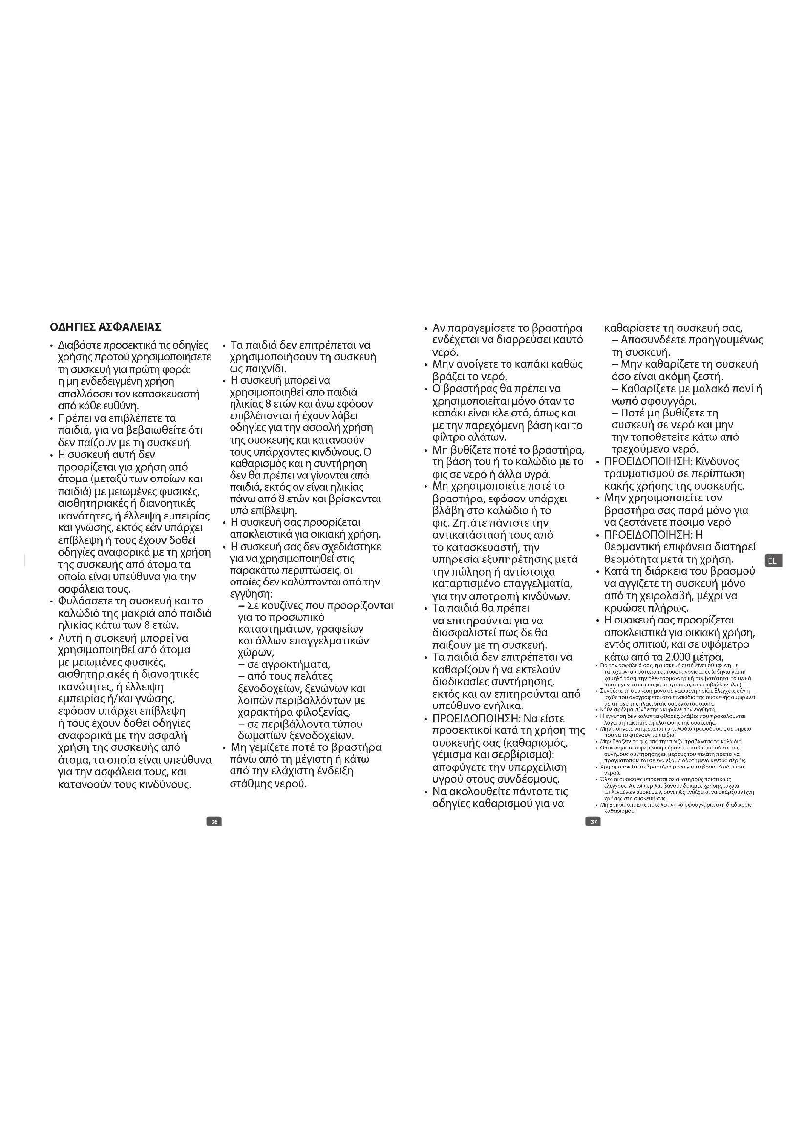 - Μη γεμίζετε ποτέ το βραστήρα πάνω από τη μέγιστη ή κάτω από την ελάχιστη ένδειξη στάθμης νερού. ΟΔΗΓΙΕΣ ΑΣΦΑΛΕΙΑΣ EL3938 TÜRKÇE KULLANMA ve TANITMA KILAVUZU (NC00141901) ΕΑΝ Ο ΒΡΑΣΤΗΡΑΣ ΣΑΣ ΥΠΟΣΤΕΙ ΠΤΩΣΗ, ΠΑΡΟΥΣΙΑΖΕΙ ΔΙΑΡΡΟΕΣ, ΕΑΝ ΤΟ ΚΑΛΩΔΙΟ, ΤΟ ΒΥΣΜΑ Ή Η ΒΑΣΗ ΤΟΥ ΒΡΑΣΤΗΡΑ ΠΑΡΟΥΣΙΑΖΟΥΝ ΕΜΦΑΝΕΙΣ ΒΛΑΒΕΣ ΑΠΟΦΥΓΗ ΟΙΚΙΑΚΩΝ ΑΤΥΧΗΜΑΤΩΝ Για ένα παιδί, ακόμη και ένα ελαφρύ έγκαυμα μπορεί μερικές φορές να είναι σοβαρό. Καθώς τα παιδιά μεγαλώνουν, διδάξτε τους να είναι προσεκτικά ως προς τα καυτά υγρά που μπορεί να βρίσκονται στην κουζίνα. Σας συνιστούμε να τοποθετήσετε τον βραστήρα και το καλώδιο στο πίσω μέρος της επιφάνειας εργασίας, σε χώρο όπου δεν έχουν πρόσβαση τα παιδιά. Σε περίπτωση ατυχήματος, ρίξτε αμέσως κρύο νερό πάνω στο έγκαυμα και συμβουλευθείτε γιατρό, εφόσον απαιτηθεί.