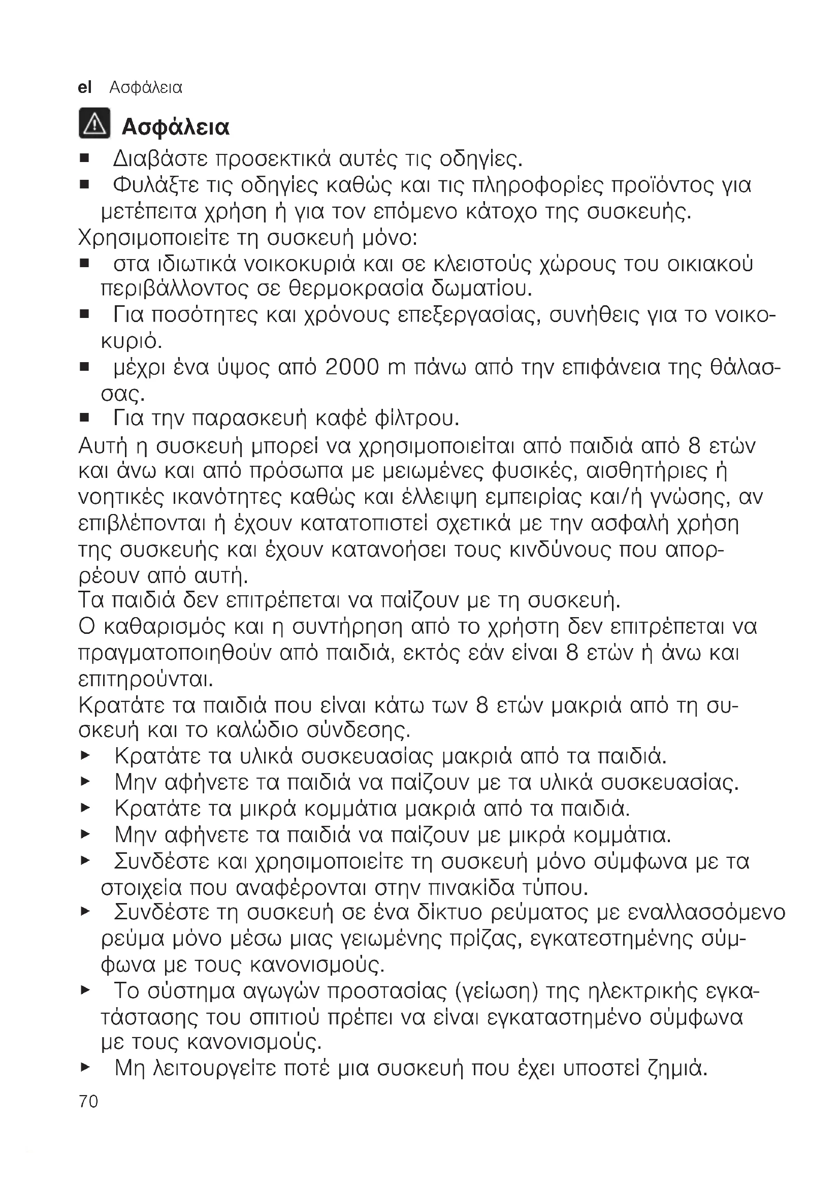 ¡ Για την παρασκευή καφέ φίλτρου. Αυτή η συσκευή μπορεί να χρησιμοποιείται από παιδιά από 8 ετών και άνω και από πρόσωπα με μειωμένες φυσικές, αισθητήριες ή νοητικές ικανότητες καθώς και έλλειψη εμπειρίας και/ή γνώσης, αν επιβλέπονται ή έχουν κατατοπιστεί σχετικά με την ασφαλή χρήση της συσκευής και έχουν κατανοήσει τους κινδύνους που απορ- ρέουν από αυτή. Τα παιδιά δεν επιτρέπεται να παίζουν με τη συσκευή. Ο καθαρισμός και η συντήρηση από το χρήστη δεν επιτρέπεται να πραγματοποιηθούν από παιδιά, εκτός εάν είναι 8 ετών ή άνω και επιτηρούνται. Κρατάτε τα παιδιά που είναι κάτω των 8 ετών μακριά από τη συ- σκευή και το καλώδιο σύνδεσης. ▶ Κρατάτε τα υλικά συσκευασίας μακριά από τα παιδιά. ▶ Μην αφήνετε τα παιδιά να παίζουν με τα υλικά συσκευασίας. ▶ Κρατάτε τα μικρά κομμάτια μακριά από τα παιδιά. ▶ Μην αφήνετε τα παιδιά να παίζουν με μικρά κομμάτια. ▶ Συνδέστε και χρησιμοποιείτε τη συσκευή μόνο σύμφωνα με τα στοιχεία που αναφέρονται στην πινακίδα τύπου. ▶ Συνδέστε τη συσκευή σε ένα δίκτυο ρεύματος με εναλλασσόμενο ρεύμα μόνο μέσω μιας γειωμένης πρίζας, εγκατεστημένης σύμ- φωνα με τους κανονισμούς. ▶ Το σύστημα αγωγών προστασίας (γείωση) της ηλεκτρικής εγκα- τάστασης του σπιτιού πρέπει να είναι εγκαταστημένο σύμφωνα με τους κανονισμούς. ▶ Μη λειτουργείτε ποτέ μια συσκευή που έχει υποστεί ζημιά.Ασφάλεια el