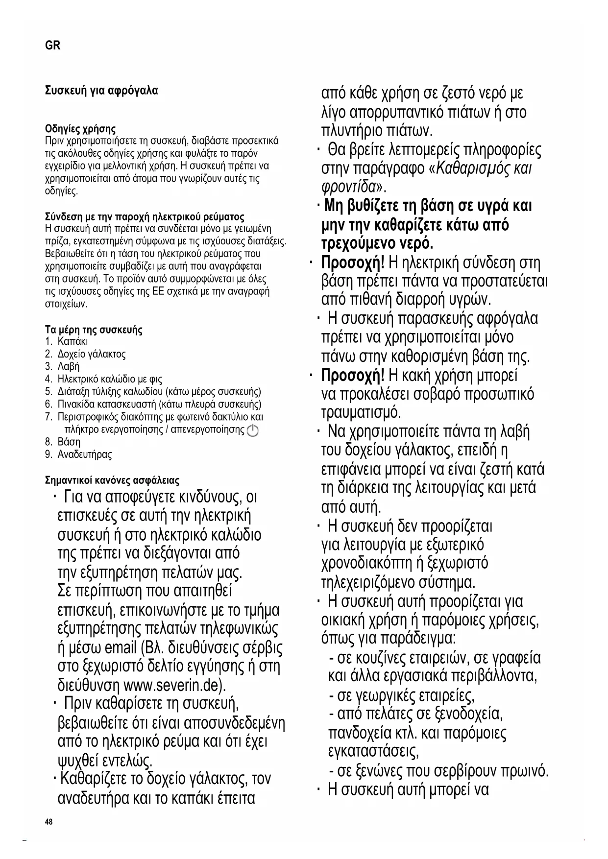 Σημαντικοί κανόνες ασφάλειας ∙ Για να αποφεύγετε κινδύνους, οι επισκευές σε αυτή την ηλεκτρική συσκευή ή στο ηλεκτρικό καλώδιο της πρέπει να διεξάγονται από την εξυπηρέτηση πελατών μας. Σε περίπτωση που απαιτηθεί επισκευή, επικοινωνήστε με το τμήμα εξυπηρέτησης πελατών τηλεφωνικώς ή μέσω email (Βλ. διευθύνσεις σέρβις στο ξεχωριστό δελτίο εγγύησης ή στη διεύθυνση www.severin.de). ∙ Πριν καθαρίσετε τη συσκευή, βεβαιωθείτε ότι είναι αποσυνδεδεμένη από το ηλεκτρικό ρεύμα και ότι έχει ψυχθεί εντελώς. ∙ Καθαρίζετε το δοχείο γάλακτος, τον αναδευτήρα και το καπάκι έπειτα από κάθε χρήση σε ζεστό νερό με λίγο απορρυπαντικό πιάτων ή στο πλυντήριο πιάτων. ∙ Θα βρείτε λεπτομερείς πληροφορίες στην παράγραφο «Καθαρισμός και