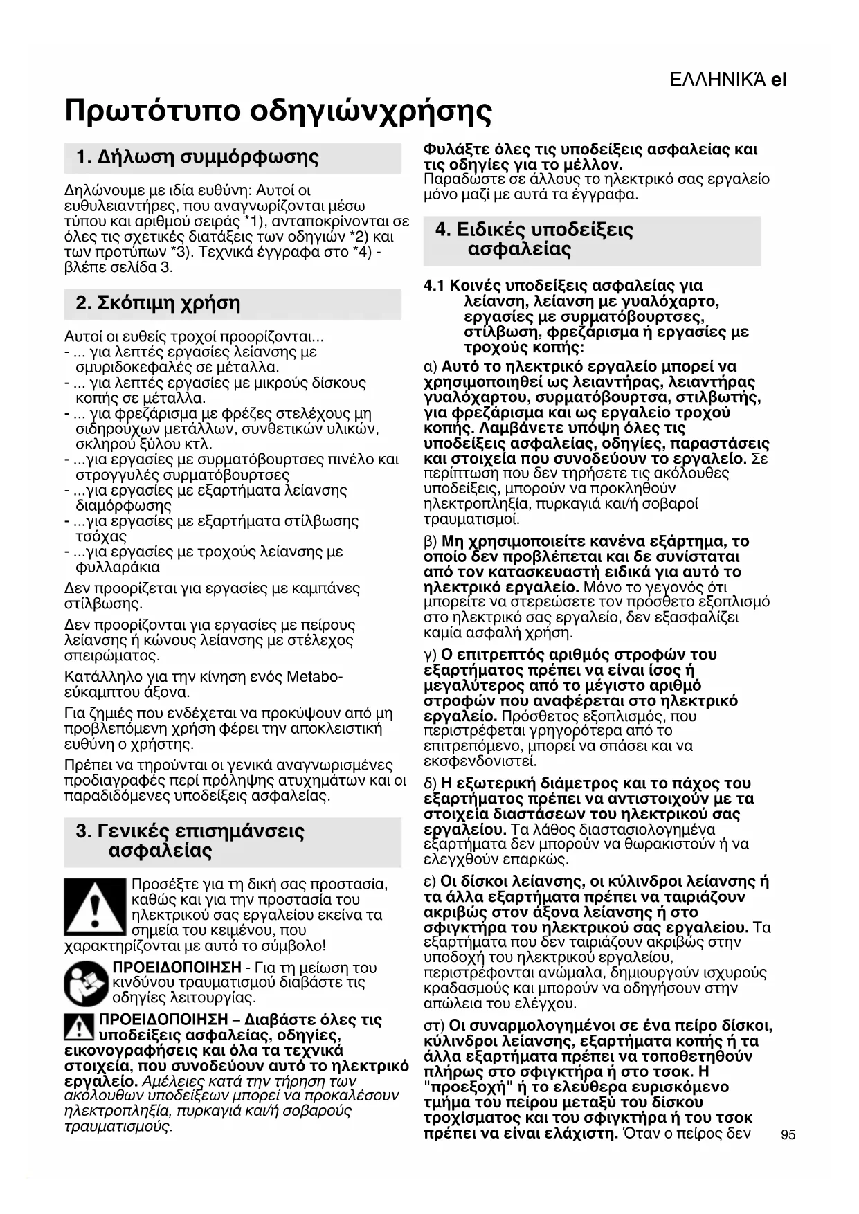 Δεν προορίζονται για εργασίες με πείρους λείανσης ή κώνους λείανσης με στέλεχος σπειρώματος. Κατάλληλο για την κίνηση ενός Metabo- εύκαμπτου άξονα. Για ζημιές που ενδέχεται να προκύψουν από μη προβλεπόμενη χρήση φέρει την αποκλειστική ευθύνη ο χρήστης. Πρέπει να τηρούνται οι γενικά αναγνωρισμένες προδιαγραφές περί πρόληψης ατυχημάτων και οι παραδιδόμενες υποδείξεις ασφαλείας. Προσέξτε για τη δική σας προστασία, καθώς και για την προστασία του ηλεκτρικού σας εργαλείου εκείνα τα σημεία του κειμένου, που χαρακτηρίζονται με αυτό το σύμβολο! ΠΡΟΕΙΔΟΠΟΙΗΣΗ - Για τη μείωση του κινδύνου τραυματισμού διαβάστε τις οδηγίες λειτουργίας. ΠΡΟΕΙΔΟΠΟΙΗΣΗ – Διαβάστε όλες τις υποδείξεις ασφαλείας, οδηγίες, εικονογραφήσεις και όλα τα τεχνικά στοιχεία, που συνοδεύουν αυτό το ηλεκτρικό εργαλείο. Αμέλειες κατά την τήρηση των ακόλουθων υποδείξεων μπορεί να προκαλέσουν ηλεκτροπληξία, πυρκαγιά και/ή σοβαρούς τραυματισμούς. Φυλάξτε όλες τις υποδείξεις ασφαλείας και τις οδηγίες για το μέλλον. Παραδώστε σε άλλους το ηλεκτρικό σας εργαλείο μόνο μαζί με αυτά τα έγγραφα.