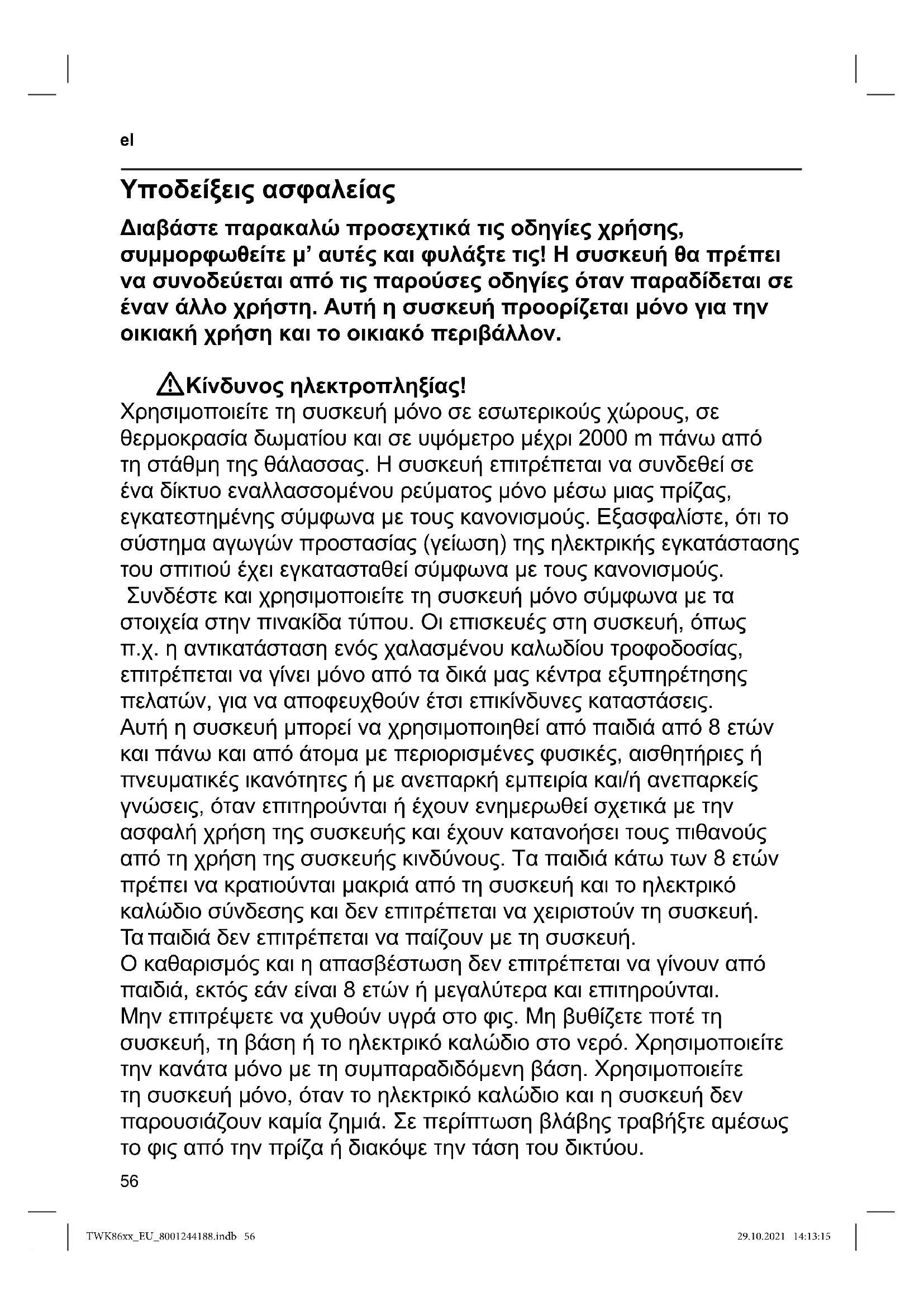ΠΡΟΕΙΔΟΠΟΙΗΣΗ: Μη χρησιμοποιείτε αυτή τη συσκευή κοντά σε μπανιέρες, ντους, νιπτήρες ή κοντά σε άλλα δοχεία που περιέχουν νερό. WΚίνδυνος ασφυξίας! Μην αφήνετε τα παιδιά να παίζουν με το υλικό συσκευασίας. WΚίνδυνος τραυματισμού! Η λάθος χρήση της συσκευής μπορεί να οδηγήσει σε τραυματισμούς. WΠροσοχή! Καθαρισμός των επιφανειών που έρχονται σε επαφή με τρόφιμα! Προσέξτε τις ειδικές υποδείξεις για τον καθαρισμό στις οδηγίες. TWK86xx_EU_8001244188.indb 56TWK86xx_EU_8001244188.indb 56 29.10.2021 14:13:1529.10.2021 14:13:1557