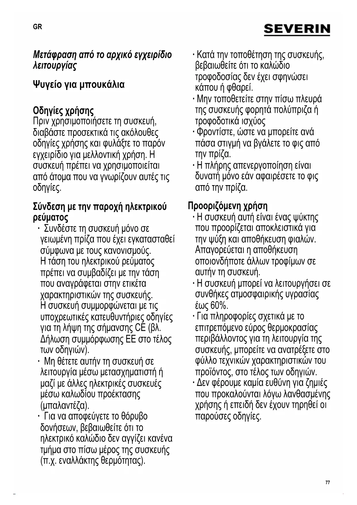 ∙ Η πλήρης απενεργοποίηση είναι δυνατή μόνο εάν αφαιρέσετε το φις από την πρίζα. Προοριζόμενη χρήση ∙ Η συσκευή αυτή είναι ένας ψύκτης που προορίζεται αποκλειστικά για την ψύξη και αποθήκευση φιαλών. Απαγορεύεται η αποθήκευση οποιονδήποτε άλλων τροφίμων σε αυτήν τη συσκευή. ∙ Η συσκευή μπορεί να λειτουργήσει σε συνθήκες ατμοσφαιρικής υγρασίας έως 60%. ∙ Για πληροφορίες σχετικά με το επιτρεπόμενο εύρος θερμοκρασίας περιβάλλοντος για τη λειτουργία της συσκευής, μπορείτε να ανατρέξετε στο φύλλο τεχνικών χαρακτηριστικών του προϊόντος, στο τέλος των οδηγιών. ∙ Δεν φέρουμε καμία ευθύνη για ζημιές που προκαλούνται λόγω λανθασμένης χρήσης ή επειδή δεν έχουν τηρηθεί οι παρούσες οδηγίες. GR78 142 x 208 mm Σημαντικοί κανόνες ασφάλειας ∙ Η συσκευή αυτή προορίζεται για εμπορική χρήση.