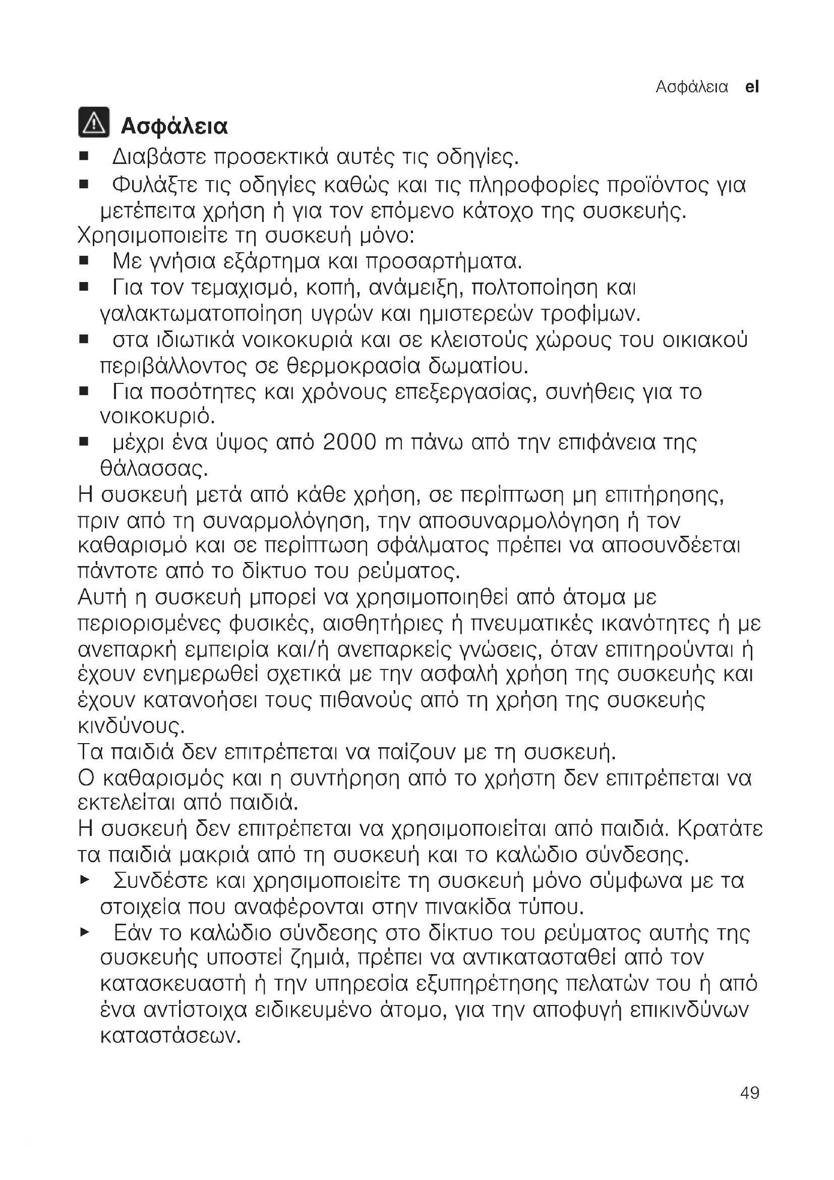 ¡ Διαβάστε προσεκτικά αυτές τις οδηγίες. ¡ Φυλάξτε τις οδηγίες καθώς και τις πληροφορίες προϊόντος για μετέπειτα χρήση ή για τον επόμενο κάτοχο της συσκευής. Χρησιμοποιείτε τη συσκευή μόνο: ¡ Με γνήσια εξάρτημα και προσαρτήματα. ¡ Για τον τεμαχισμό, κοπή, ανάμειξη, πολτοποίηση και γαλακτωματοποίηση υγρών και ημιστερεών τροφίμων. ¡ στα ιδιωτικά νοικοκυριά και σε κλειστούς χώρους του οικιακού περιβάλλοντος σε θερμοκρασία δωματίου. ¡ Για ποσότητες και χρόνους επεξεργασίας, συνήθεις για το νοικοκυριό. ¡ μέχρι ένα ύψος από 2000 m πάνω από την επιφάνεια της