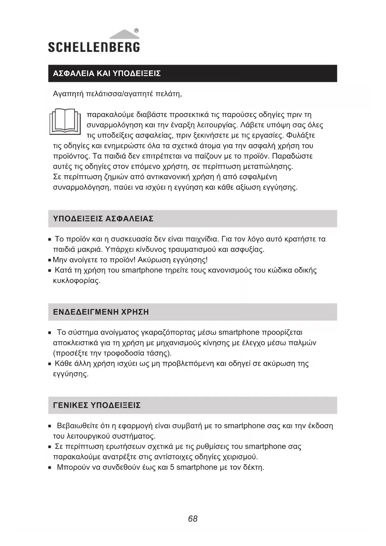 ΑΣΦΑΛΕΊΑ ΚΑΊ ΥΠΟΔΕΊΞΕΊΣ Αγαπητήπελάτισσα/αγαπητέπελάτη, παρακαλούμεδιαβάστεπροσεκτικάτιςπαρούσεςοδηγίεςπριντη συναρμολόγησηκαιτηνέναρξηλειτουργίας.Λάβετευπόψησαςόλες τιςυποδείξειςασφαλείας,πρινξεκινήσετεμετιςεργασίες.Φυλάξτε τιςοδηγίεςκαιενημερώστεόλατασχετικάάτομαγιατηνασφαλήχρήσητου προϊόντος.Ταπαιδιάδενεπιτρέπεταιναπαίζουνμετοπροϊόν.Παραδώστε αυτέςτιςοδηγίεςστονεπόμενοχρήστη,σεπερίπτωσημεταπώλησης. Σεπερίπτωσηζημιώναπόαντικανονικήχρήσηήαπόεσφαλμένη συναρμολόγηση,παύειναισχύειηεγγύησηκαικάθεαξίωσηεγγύησης. ΥΠΟΔΕΊΞΕΊΣ ΑΣΦΑΛΕΊΑΣ Τοπροϊόνκαιησυσκευασίαδενείναιπαιχνίδια.Γιατονλόγοαυτόκρατήστετα παιδιάμακριά.Υπάρχεικίνδυνοςτραυματισμούκαιασφυξίας. Μηνανοίγετετοπροϊόν!Ακύρωσηεγγύησης! Κατάτηχρήσητουsmartphoneτηρείτετουςκανονισμούςτουκώδικαοδικής κυκλοφορίας. ΕΝΔΕΔΕΊΓΜΕΝΗ ΧΡΗΣΗ Τοσύστημαανοίγματοςγκαραζόπορταςμέσωsmartphoneπροορίζεται αποκλειστικάγιατηχρήσημεμηχανισμούςκίνησηςμεέλεγχομέσωπαλμών (προσέξτετηντροφοδοσίατάσης). Κάθεάλληχρήσηισχύειωςμηπροβλεπόμενηκαιοδηγείσεακύρωσητης