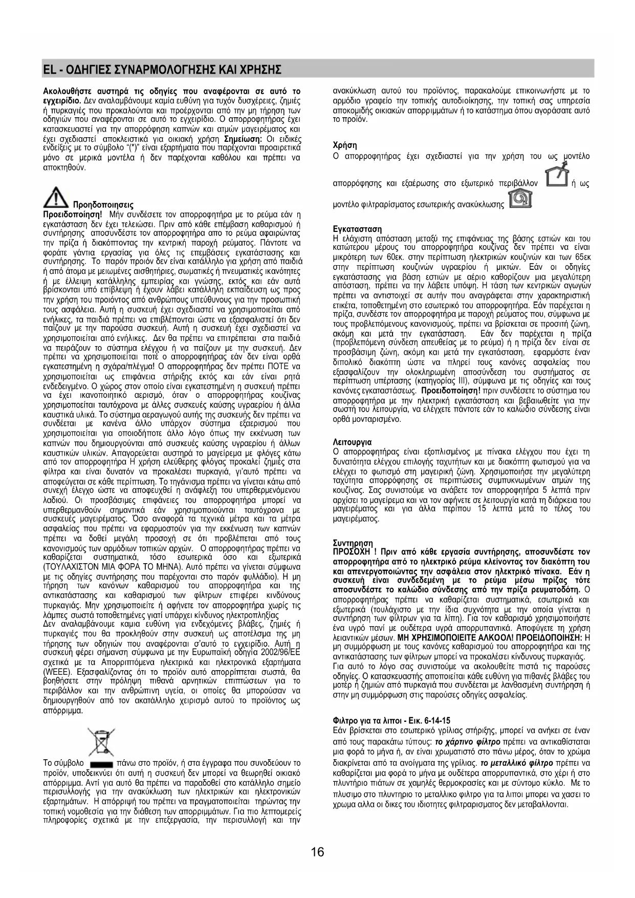 ΠΡΟΣΟΧΗ ! Πριν από κάθε εργασία συντήρησης, αποσυνδέστε τον απορροφητήρα από το ηλεκτρικό ρεύμα κλείνοντας τον διακόπτη του και απενεργοποιώντας την ασφάλεια στον ηλεκτρικό πίνακα. Εάν η συσκευή είναι συνδεδεμένη με το ρεύμα μέσω πρίζας τότε αποσυνδέστε το καλώδιο σύνδεσης από την πρίζα ρευματοδότη. Ο απορροφητήρας πρέπει να καθαρίζεται συστηματικά, εσωτερικά