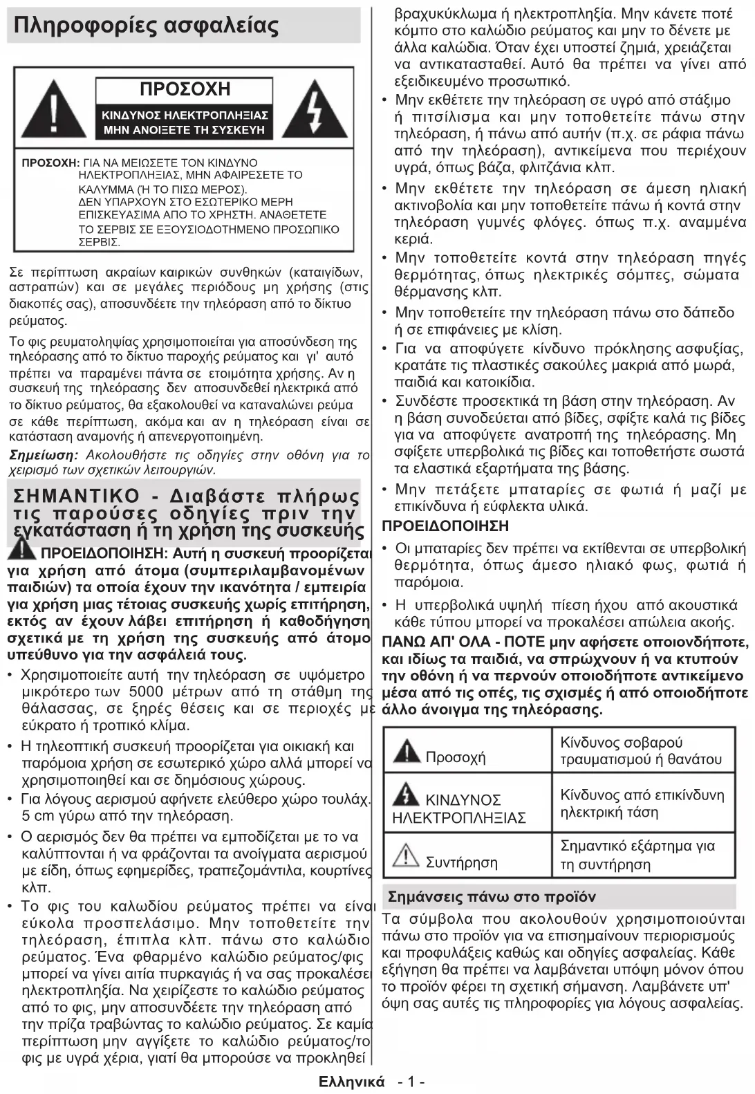 Προϊόν λέιζερ Κατηγορίας 1: Αυτό το προϊόν περιέχει πηγή λέιζερ κατηγορίας 1 η οποία είναι ασφαλής υπό εύλογα προβλέψιμες συνθή- κες λειτουργίας. ΠΡΟΕΙΔΟΠΟΙΗΣΗ Προσέχετε να μην καταποθεί η μπαταρία, Κίνδυνος Χημικών Εγκαυμάτων Αυτό το προϊόν ή τα αξεσουάρ που συνοδεύουν το προϊόν μπορεί να περιέχουν μπαταρία τύπου κέρ- ματος/κουμπιού. Αν καταποθεί η μπαταρία τύπου κέρματος/κουμπιού, μπορεί να προκαλέσει σοβαρά εσωτερικά εγκαύματα σε μόλις 2 ώρες και μπορεί να επιφέρει το θάνατο. Κρατάτε καινούργιες και χρησιμοποιημένες μπαταρίες μακριά από παιδιά. Αν το διαμέρισμα μπαταρίας δεν κλείνει με ασφάλεια, σταματήστε τη χρήση του προϊόντος και κρατήστε το μακριά από παιδιά. Αν πιστεύετε ότι μπαταρίες μπορεί να έχουν καταποθεί ή τοποθετηθεί μέσα σε οποιοδήποτε μέρος του σώμα- τος, ζητήστε άμεση ιατρική προσοχή. – – – – – – – – – – – – Μια τηλεόραση μπορεί να πέσει, προκαλώντας σοβαρό τραυματισμό ή θάνατο. Πολλοί τραυματισμοί, ειδικά σε παιδιά, μπορούν να αποφευχθούν με τη λήψη απλών προφυλάξεων όπως: