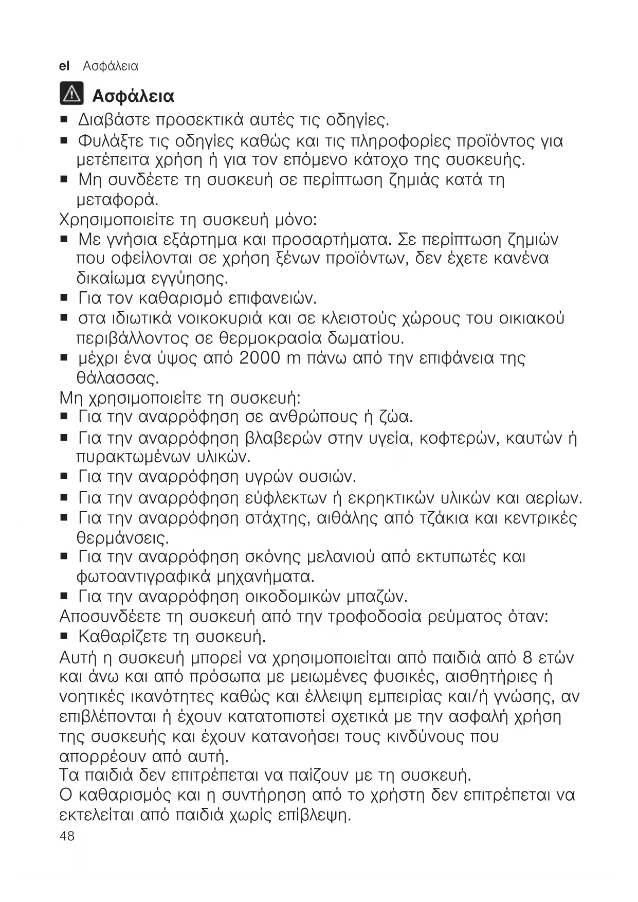 Μη χρησιμοποιείτε τη συσκευή: ¡ Για την αναρρόφηση σε ανθρώπους ή ζώα. ¡ Για την αναρρόφηση βλαβερών στην υγεία, κοφτερών, καυτών ή πυρακτωμένων υλικών. ¡ Για την αναρρόφηση υγρών ουσιών. ¡ Για την αναρρόφηση εύφλεκτων ή εκρηκτικών υλικών και αερίων. ¡ Για την αναρρόφηση στάχτης, αιθάλης από τζάκια και κεντρικές θερμάνσεις. ¡ Για την αναρρόφηση σκόνης μελανιού από εκτυπωτές και φωτοαντιγραφικά μηχανήματα. ¡ Για την αναρρόφηση οικοδομικών μπαζών. Αποσυνδέετε τη συσκευή από την τροφοδοσία ρεύματος όταν: ¡ Καθαρίζετε τη συσκευή. Αυτή η συσκευή μπορεί να χρησιμοποιείται από παιδιά από 8 ετών και άνω και από πρόσωπα με μειωμένες φυσικές, αισθητήριες ή νοητικές ικανότητες καθώς και έλλειψη εμπειρίας και/ή γνώσης, αν επιβλέπονται ή έχουν κατατοπιστεί σχετικά με την ασφαλή χρήση της συσκευής και έχουν κατανοήσει τους κινδύνους που απορρέουν από αυτή. Τα παιδιά δεν επιτρέπεται να παίζουν με τη συσκευή. Ο καθαρισμός και η συντήρηση από το χρήστη δεν επιτρέπεται να εκτελείται από παιδιά χωρίς επίβλεψη.Ασφάλεια el