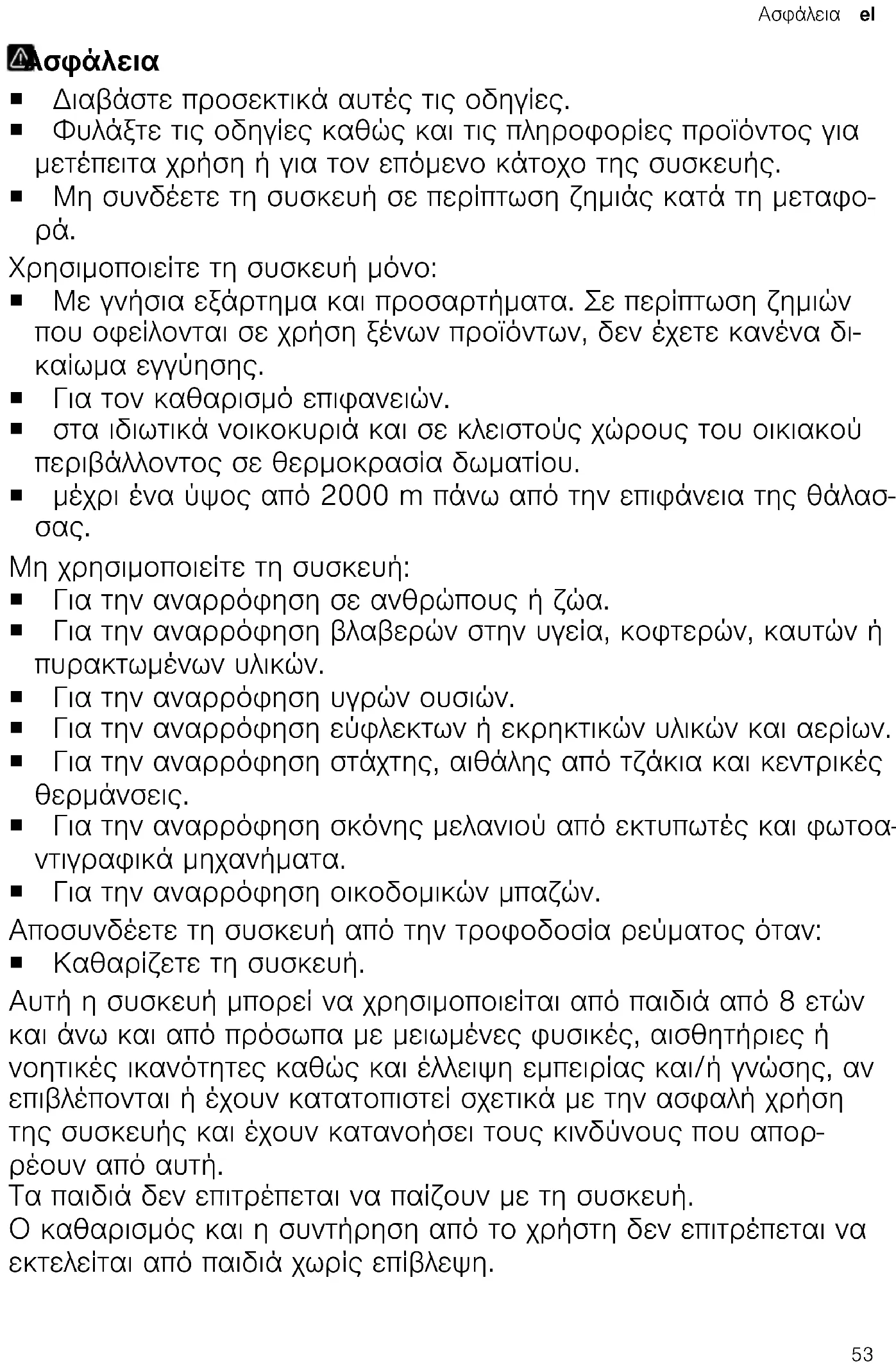 Μη χρησιμοποιείτε τη συσκευή: ¡ Για την αναρρόφηση σε ανθρώπους ή ζώα. ¡ Για την αναρρόφηση βλαβερών στην υγεία, κοφτερών, καυτών ή πυρακτωμένων υλικών. ¡ Για την αναρρόφηση υγρών ουσιών. ¡ Για την αναρρόφηση εύφλεκτων ή εκρηκτικών υλικών και αερίων. ¡ Για την αναρρόφηση στάχτης, αιθάλης από τζάκια και κεντρικές θερμάνσεις. ¡ Για την αναρρόφηση σκόνης μελανιού από εκτυπωτές και φωτοα- ντιγραφικά μηχανήματα. ¡ Για την αναρρόφηση οικοδομικών μπαζών. Αποσυνδέετε τη συσκευή από την τροφοδοσία ρεύματος όταν: ¡ Καθαρίζετε τη συσκευή. Αυτή η συσκευή μπορεί να χρησιμοποιείται από παιδιά από 8 ετών και άνω και από πρόσωπα με μειωμένες φυσικές, αισθητήριες ή νοητικές ικανότητες καθώς και έλλειψη εμπειρίας και/ή γνώσης, αν επιβλέπονται ή έχουν κατατοπιστεί σχετικά με την ασφαλή χρήση της συσκευής και έχουν κατανοήσει τους κινδύνους που απορ- ρέουν από αυτή. Τα παιδιά δεν επιτρέπεται να παίζουν με τη συσκευή. Ο καθαρισμός και η συντήρηση από το χρήστη δεν επιτρέπεται να εκτελείται από παιδιά χωρίς επίβλεψη. 53el Ασφάλεια Μόνο εκπαιδευμένο γι’ αυτό, ειδικευμένο προσωπικό επιτρέπεται να πραγματοποιήσει επισκευές στη συσκευή. Μόνο γνήσια ανταλλακτικά επιτρέπεται να χρησιμοποιηθούν για την επισκευή της συσκευής. Εάν το καλώδιο σύνδεσης στο δίκτυο του ρεύματος αυτής της συσκευής υποστεί ζημιά, πρέπει να αντικατασταθεί από τον κατα- σκευαστή ή την υπηρεσία εξυπηρέτησης πελατών του ή από ένα αντίστοιχα ειδικευμένο άτομο, για την αποφυγή επικινδύνων κα-