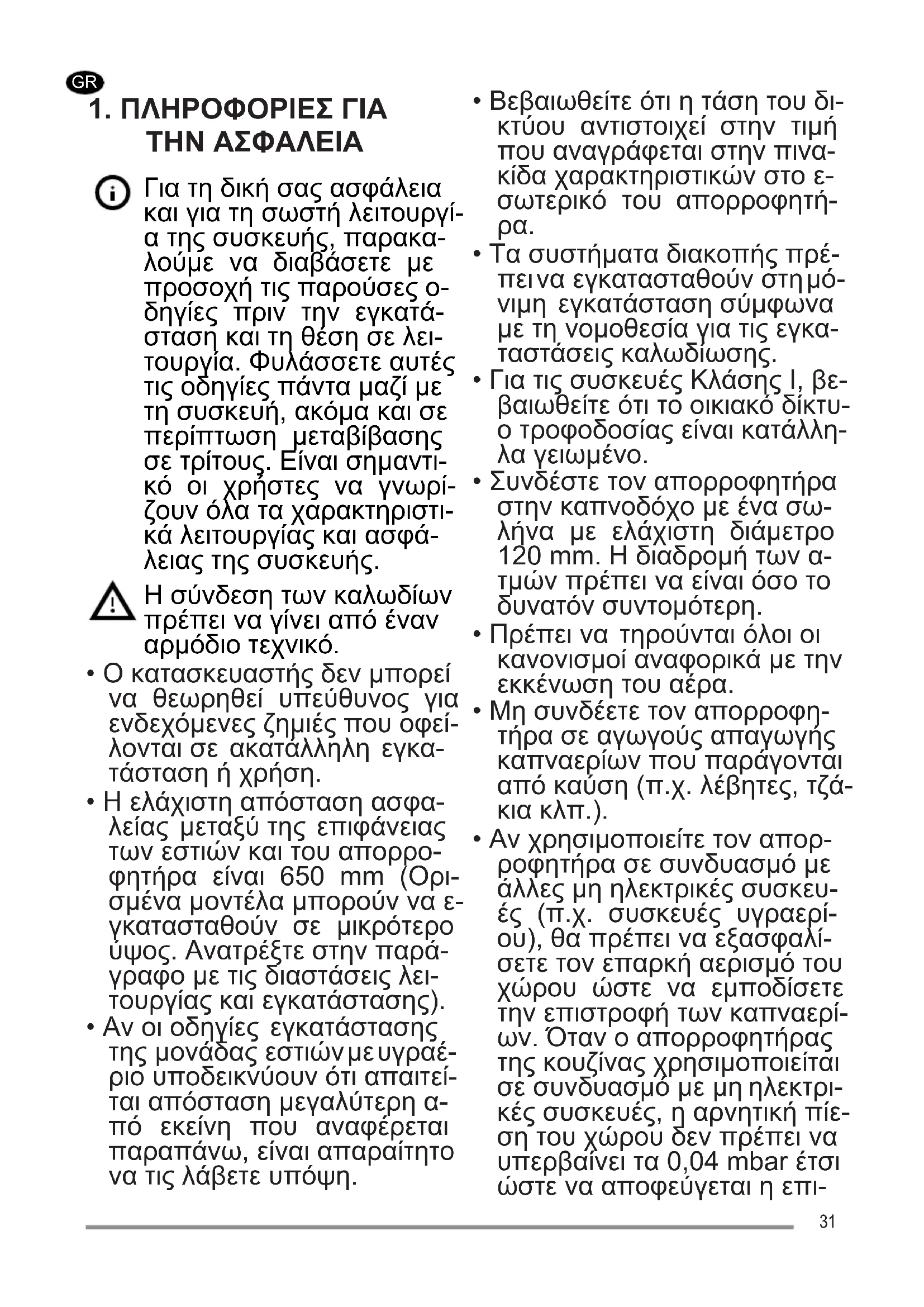 - Αν χρησιμοποιείτε τον απορ- ροφητήρα σε συνδυασμό με άλλες μη ηλεκτρικές συσκευ- ές (π.χ. συσκευές υγραερί- ου), θα πρέπει να εξασφαλί- σετε τον επαρκή αερισμό του χώρου ώστε να εμποδίσετε την επιστροφή των καπναερί- ων. Όταν ο απορροφητήρας της κουζίνας χρησιμοποιείται σε συνδυασμό με μη ηλεκτρι- κές συσκευές, η αρνητική πίε- ση του χώρου δεν πρέπει να υπερβαίνει τα 0,04 mbar έτσι ώστε να αποφεύγεται η επι- 31στροφή των καπναερίων στο χώρο και η αναρρόφησή τους από τον απορροφητήρα.